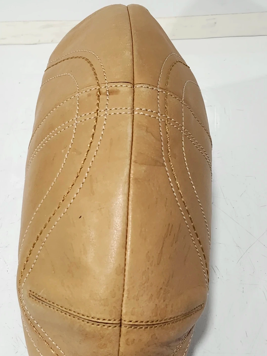 This is a Coach hobo bag, handcrafted from tan leather. It features stitching details and silver-tone hardware. Leather material.