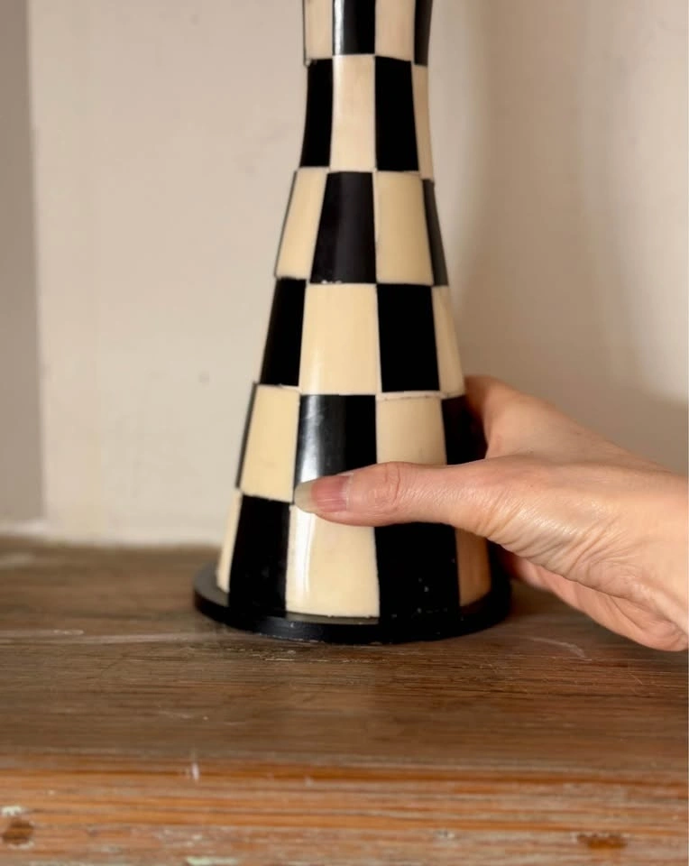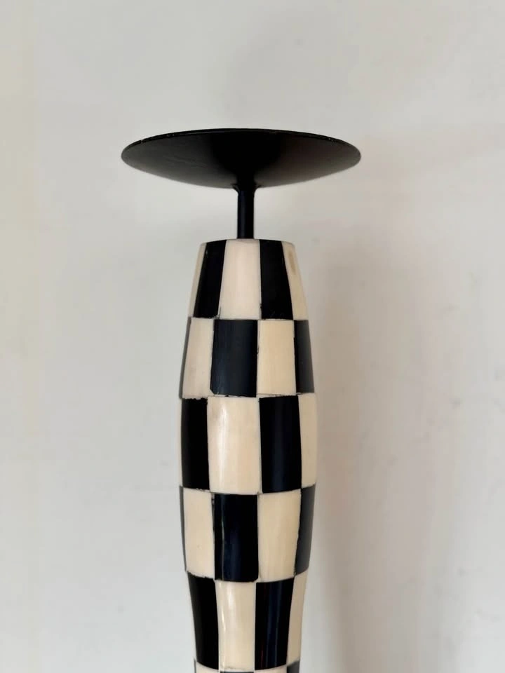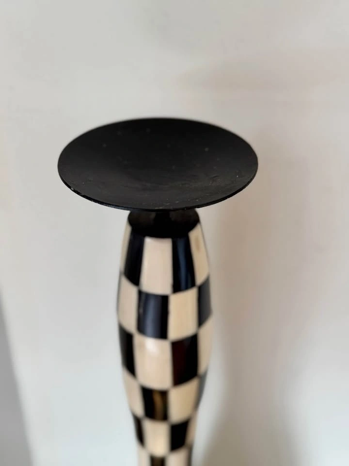 Standing at an impressive 16.5 inches, this statement piece features a bold black and white checkered pattern and a sturdy metal candle plate.