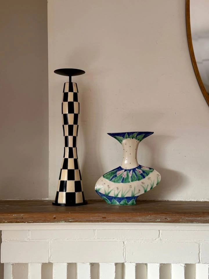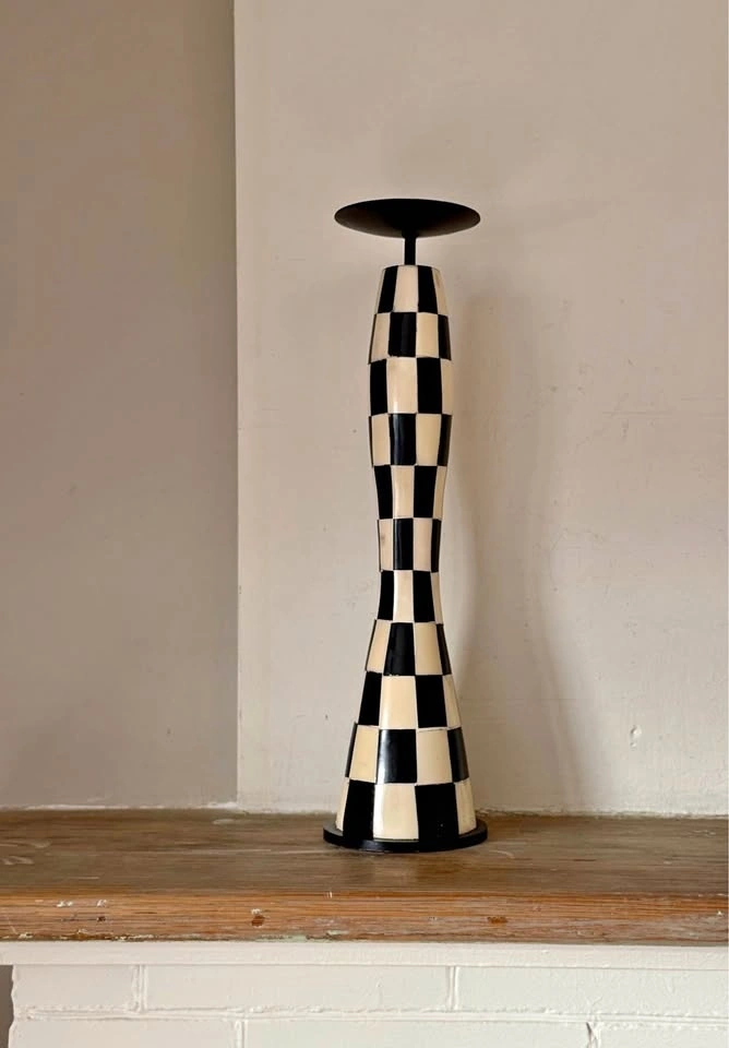 Standing at an impressive 16.5 inches, this statement piece features a bold black and white checkered pattern and a sturdy metal candle plate.