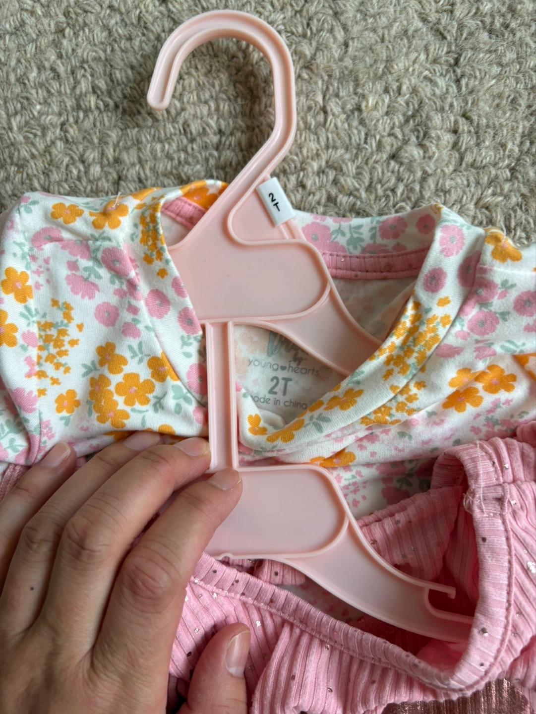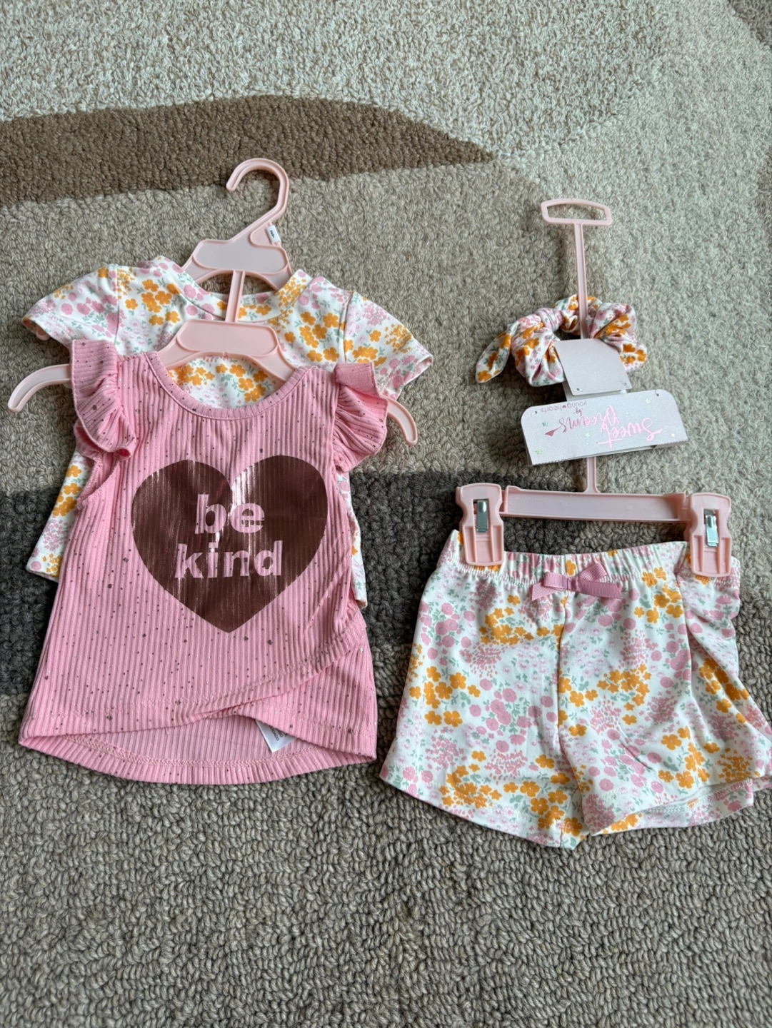 Lovely girls' outfit. Consists of a floral top, pink top with a heart detail, and shorts. Includes a matching scrunchie. This outfit can be a great addition to a wardrobe for a toddler girl.