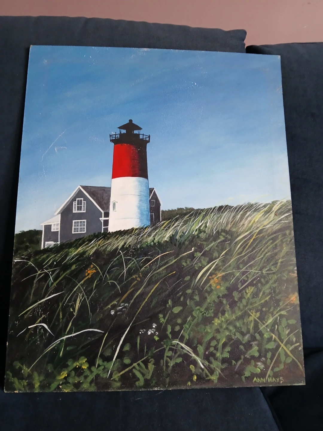 This is a framed acrylic painting depicting the Nauset Lighthouse. The artwork is signed by the artist, Ann Hays: New Jersey based she Is known for her focus on coastal subjects decor. Era: Late 20th century 1970-1990 It's a lovely piece for coastal enthusiasts! While she is primarily recognized for her layered water colors, this 16x20 piece appears to be an earlier work in Oil or Acylic on board, capturing the iconic Nauset Lighthouse located in Eastham, Massachusetts, in Cape Cod. A very recognizable landmark. A classic maritime scene featuring the famous red and white lighthouse. Condition: good vintage Condition. Minor surface scuffs in the sky area ( as pictured ), consistent with age. Frame is sturdy, clean and ready for hanging.