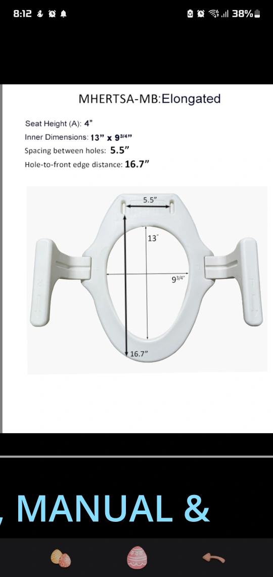 This is a MOBB Health Care 4" elongated toilet seat raiser. It's designed with new handles for added support. The inner dimensions are 13" x 9 3/4", and the seat height is 4".