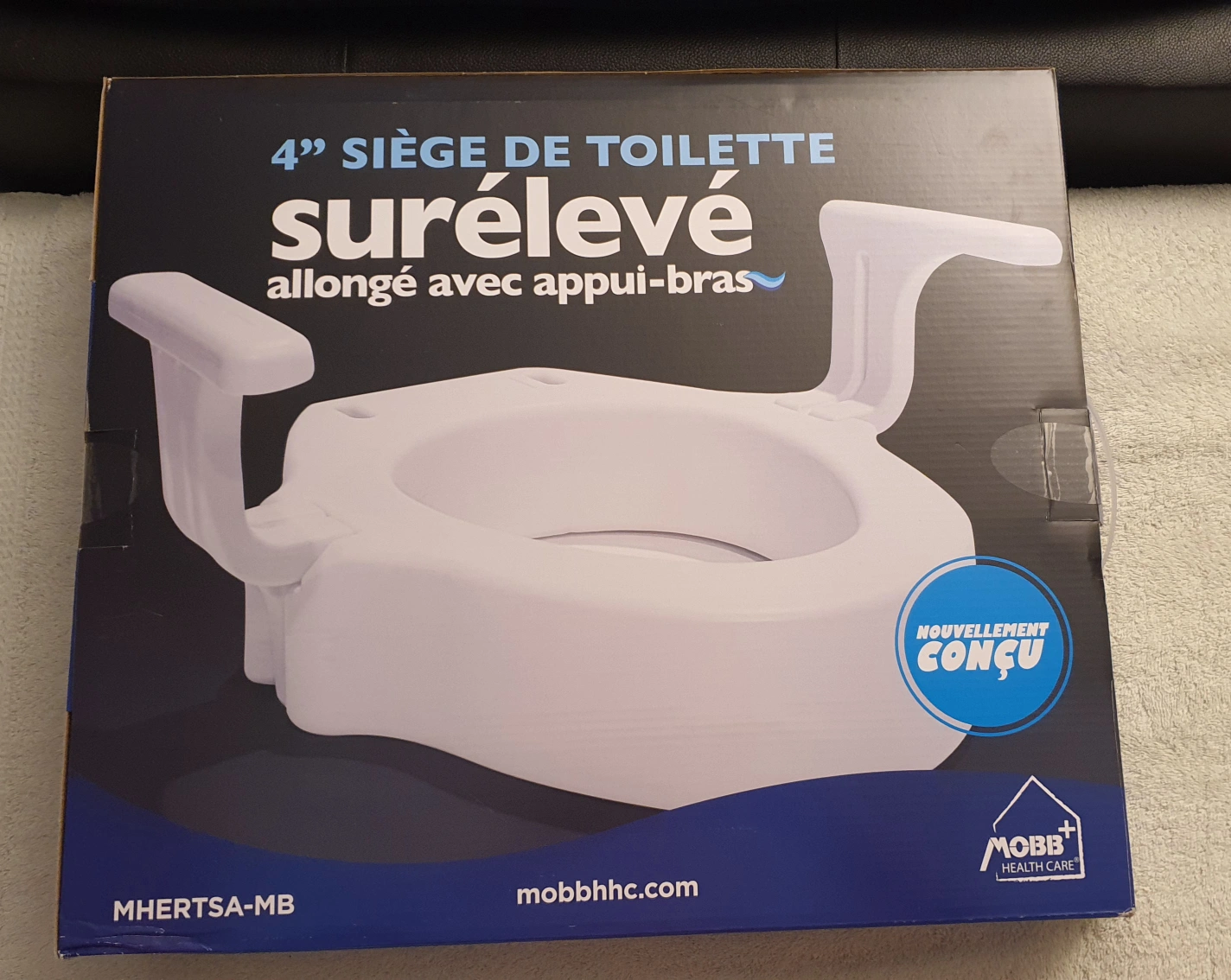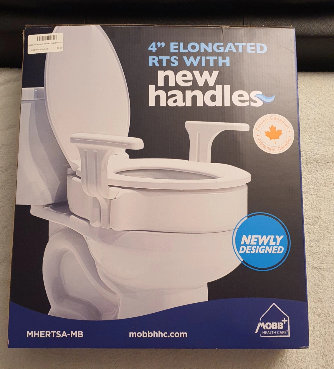 This is a MOBB Health Care 4" elongated toilet seat raiser. It's designed with new handles for added support. The inner dimensions are 13" x 9 3/4", and the seat height is 4".