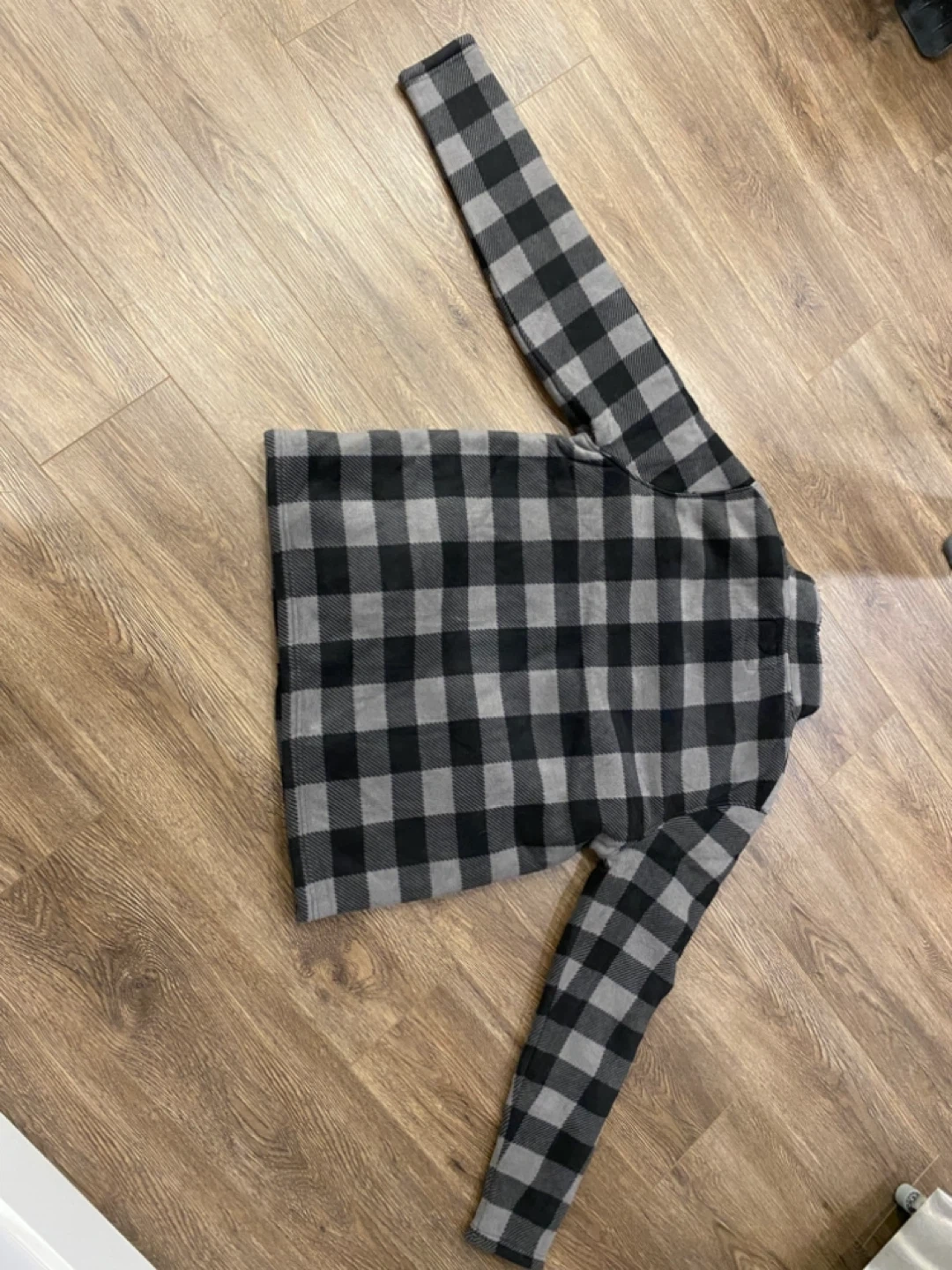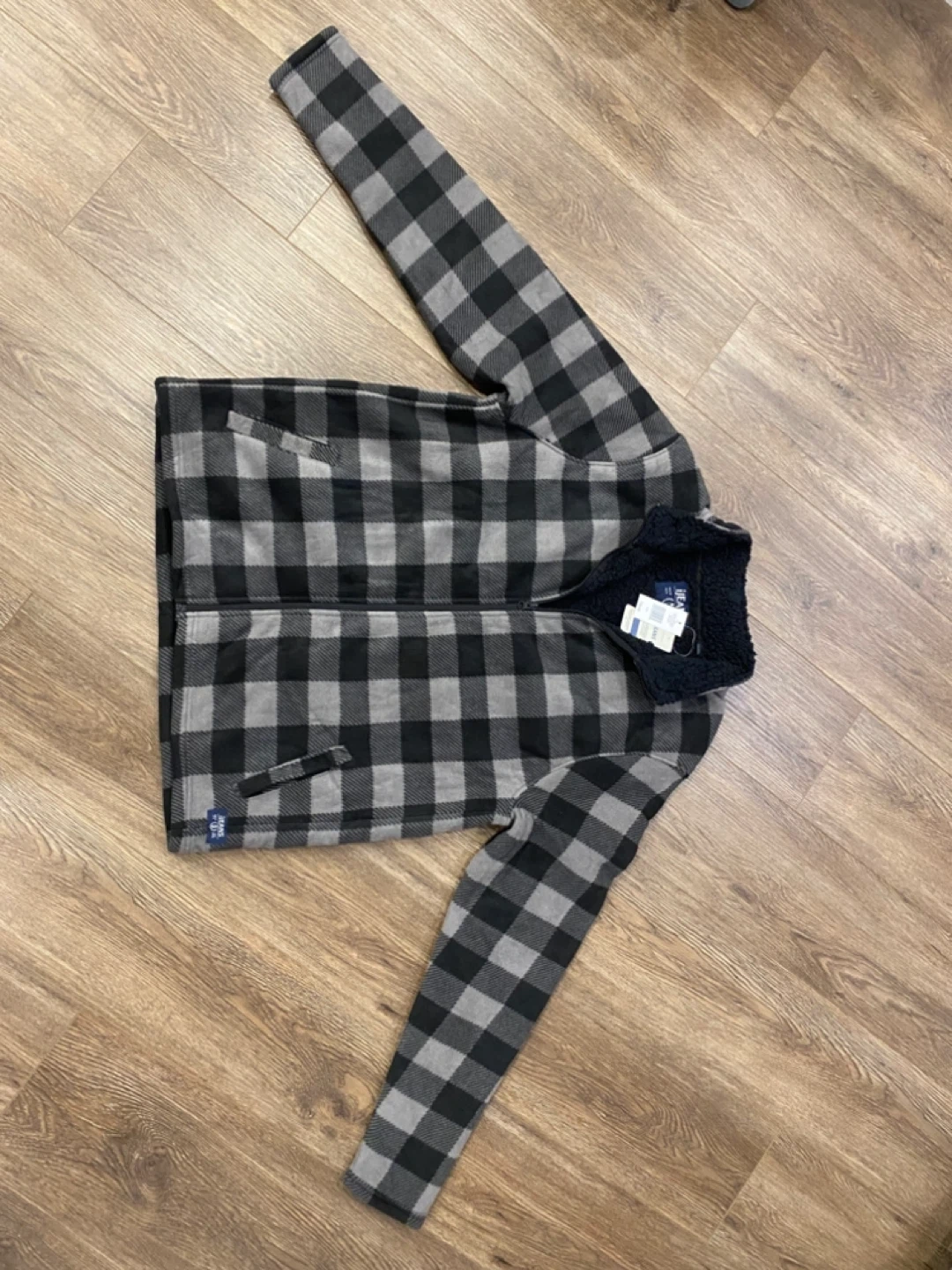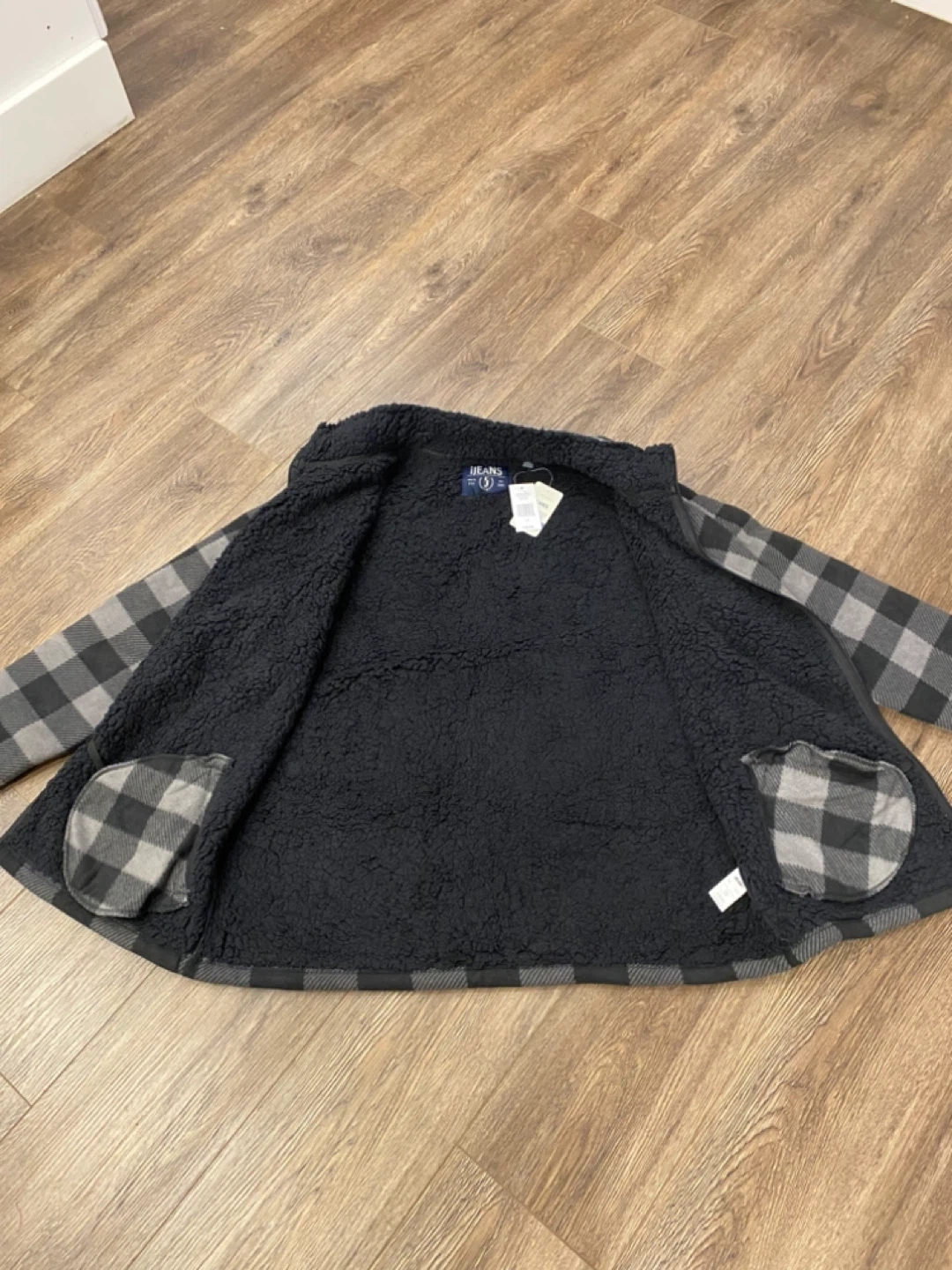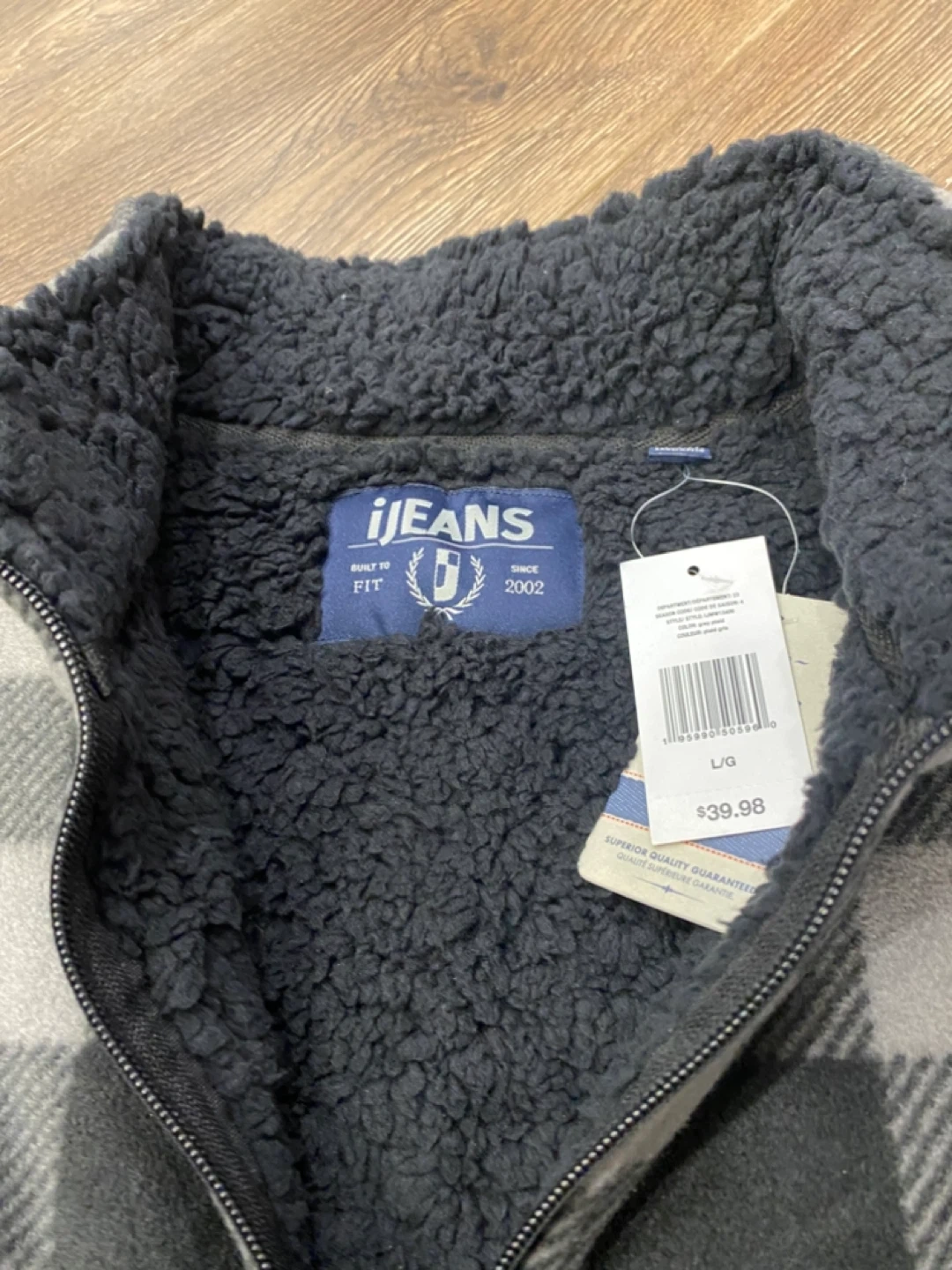 60Cozy iJeans fleece jacket in a classic plaid pattern. It's a size large and features a soft, sherpa-like lining for extra warmth. The jacket has a full zip closure and handy pockets. Originally priced at $39.98!