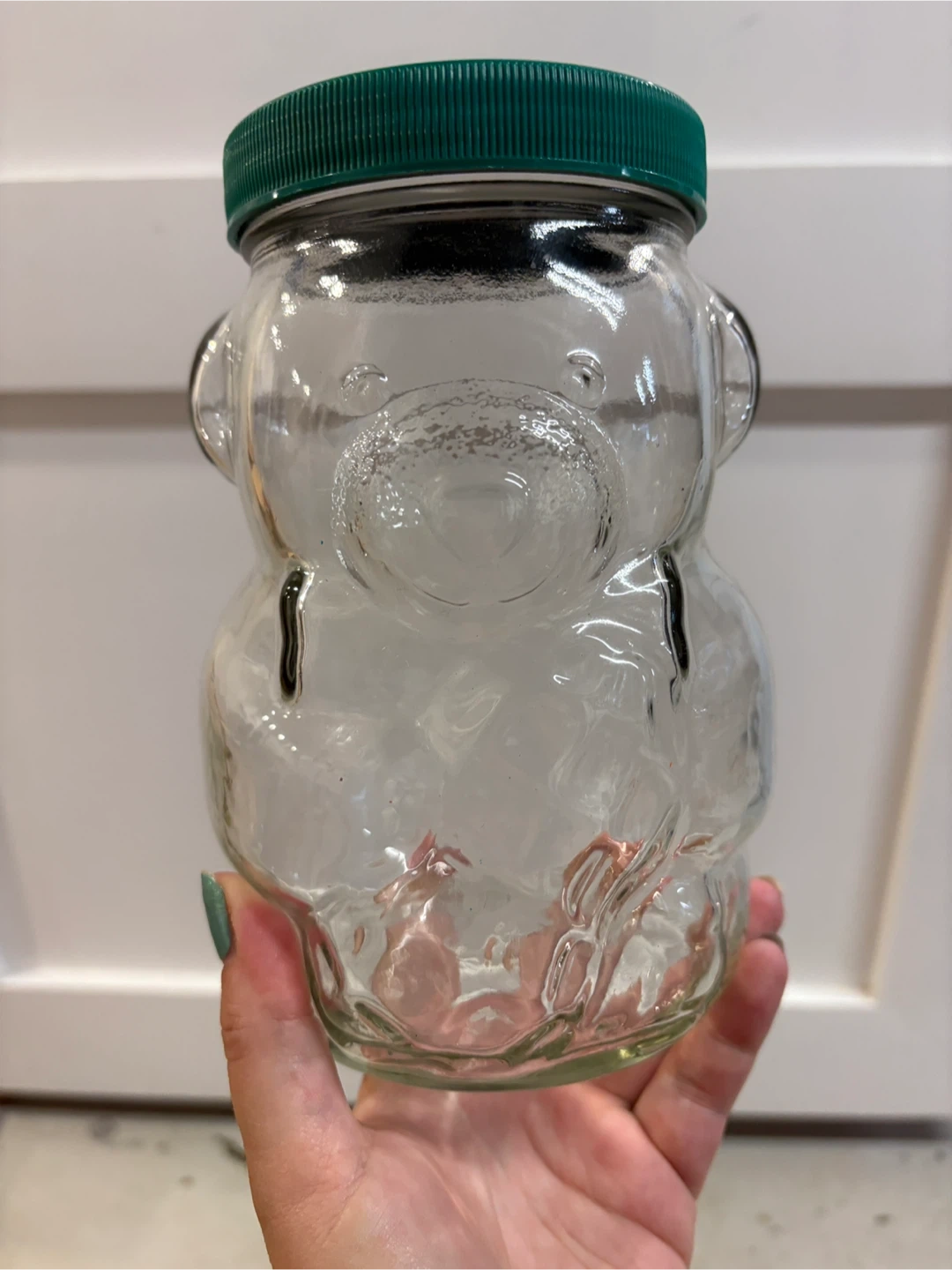 Selling a cute clear glass jar shaped like a bear! It has a green lid with a hole for coins