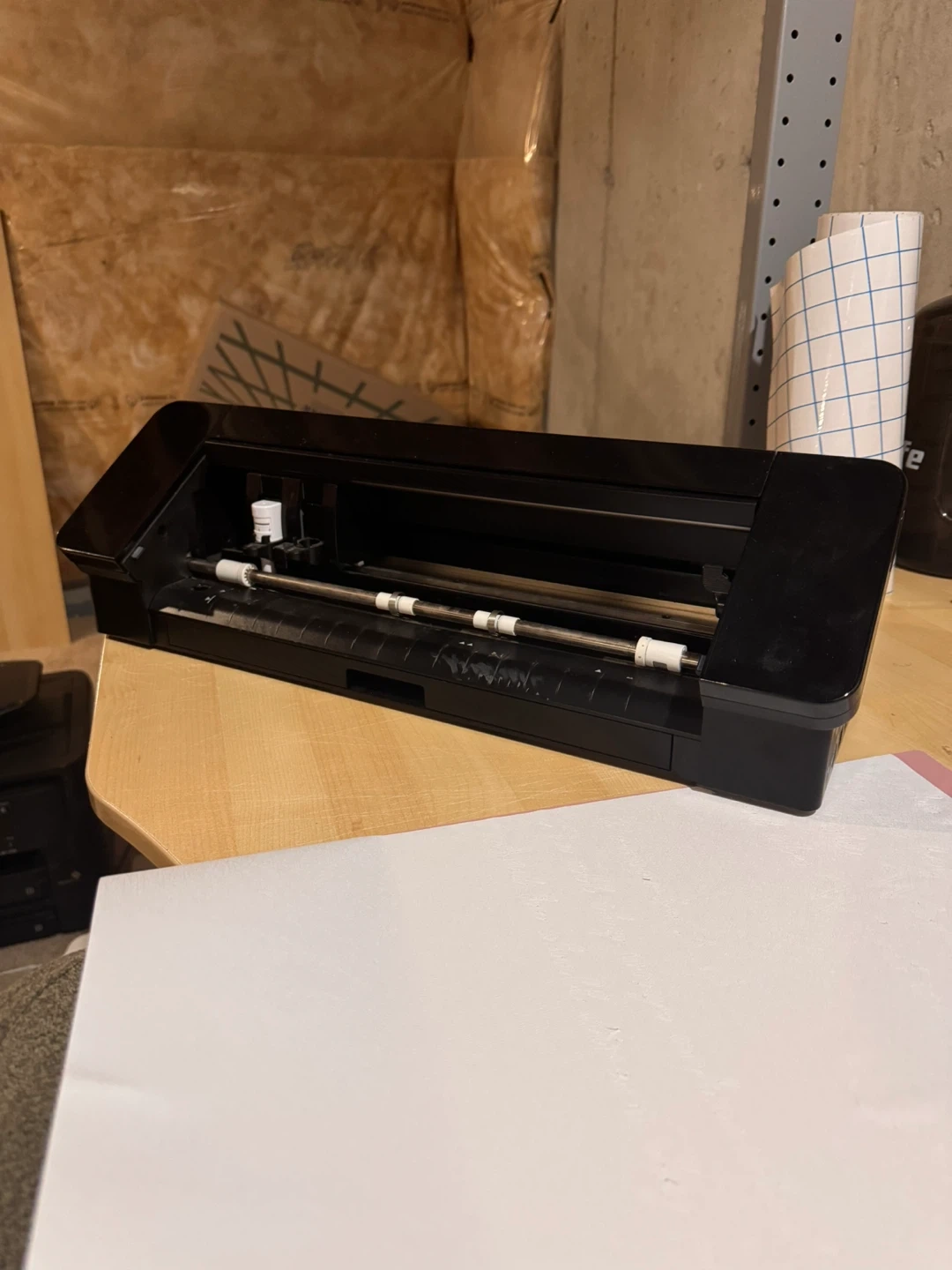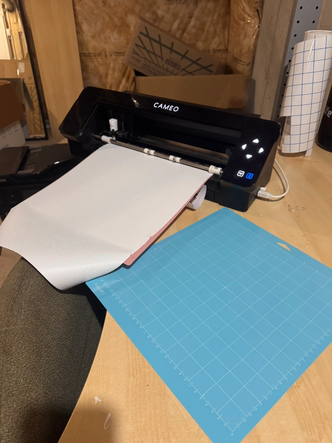 Selling a black Silhouette Cameo cutting machine. It's in good working condition and includes a blue cutting mat and several pieces of colourful heat transfer vinyl. This machine is great for crafting and making custom decals.