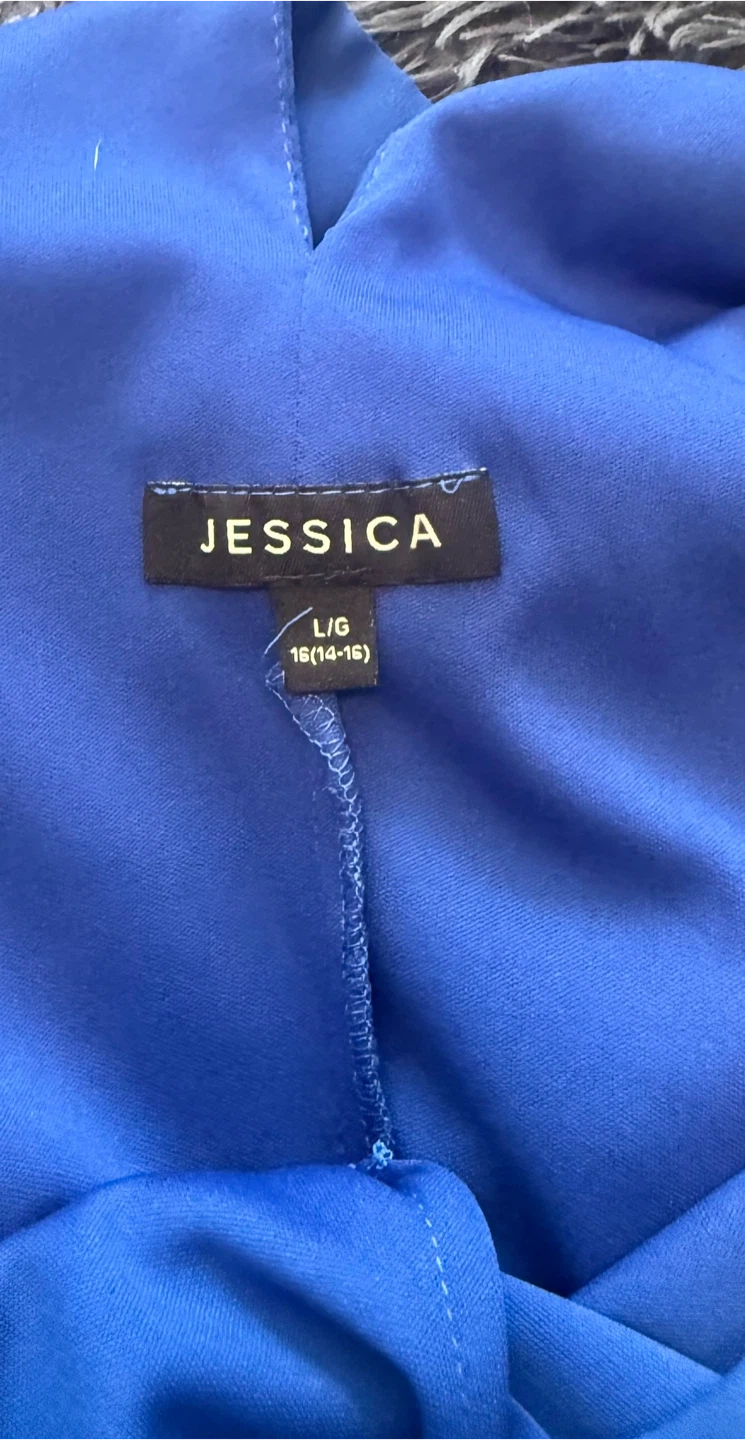 This Jessica dress is a lovely royal blue colour. It's a halter neck style with a gathered waist. Size L/G (14-16).
