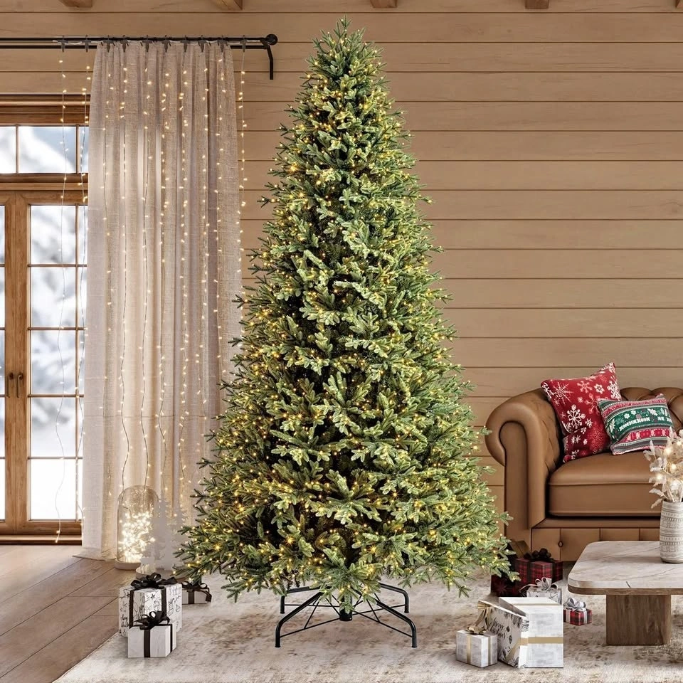 This 9ft Pre-Lit Aspen Artificial Christmas Tree is a stunning addition to any holiday decor. It features 2,700 color-changing Radiant Micro Twinkle LED® lights with twinkling effects, creating a festive glow. With EZ Connect Technology, the pole-to-pole lighting ensures seamless setup. The 7,183 Simple Shape realistic branch tips spring into shape instantly for a full appearance. It comes with a sturdy metal tree stand with a locking mechanism for a stable foundation and a wireless remote control to select from 11 different twinkling light effects. Compare at $999 online.