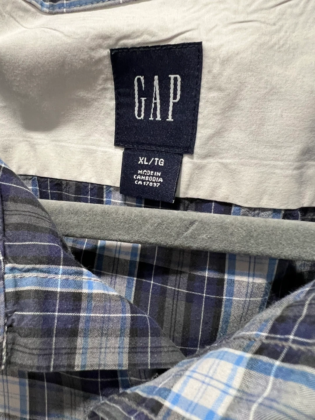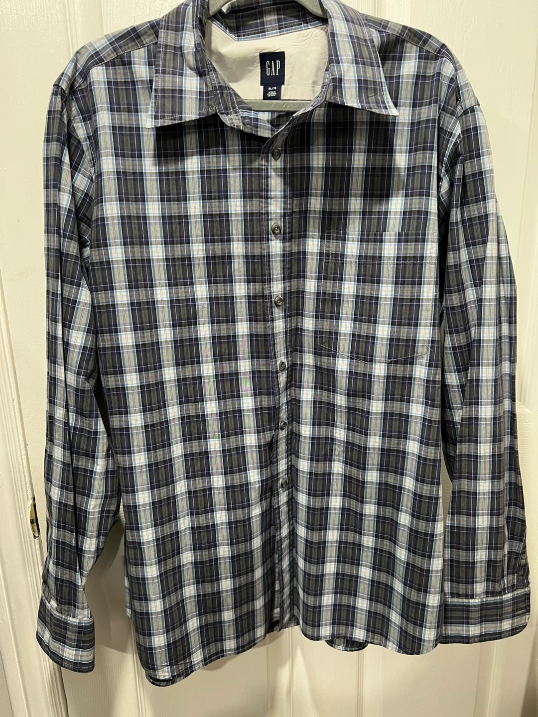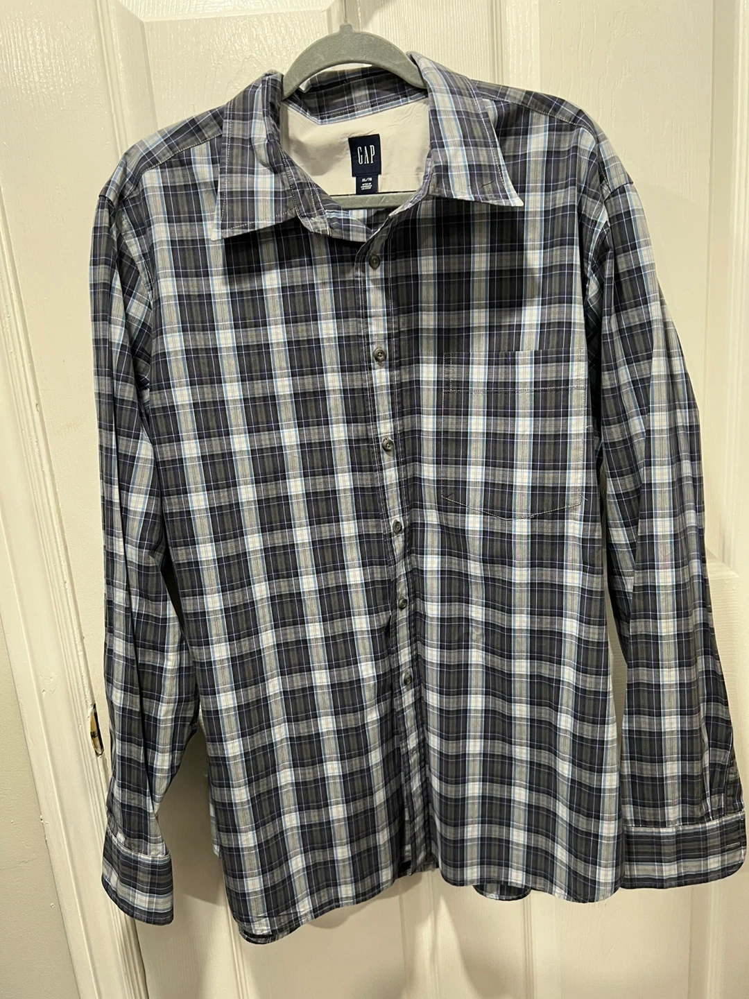 Men's GAP long-sleeve button-up shirt with a blue, grey, and white plaid pattern. It's a size XL. Great for casual wear!