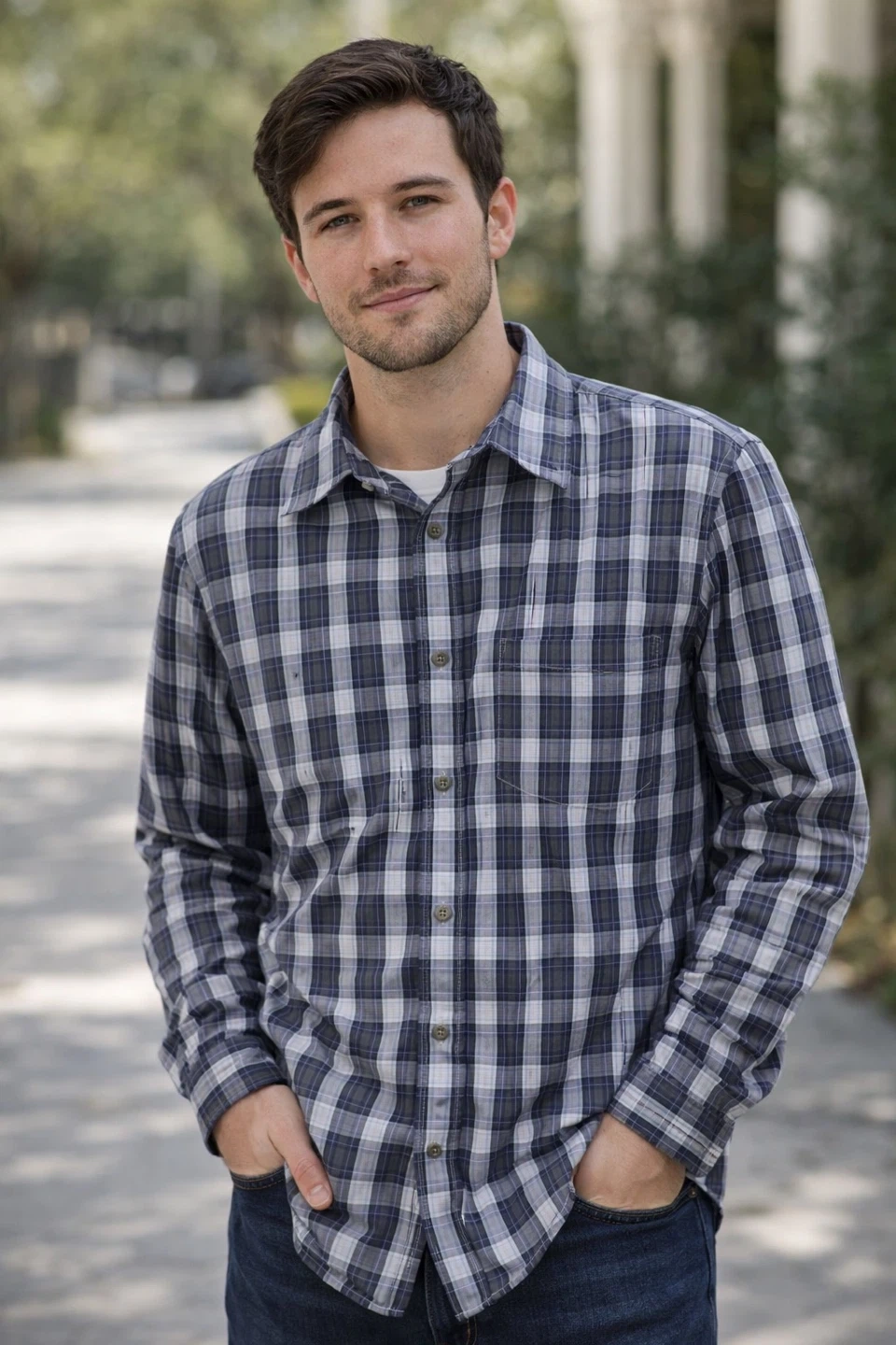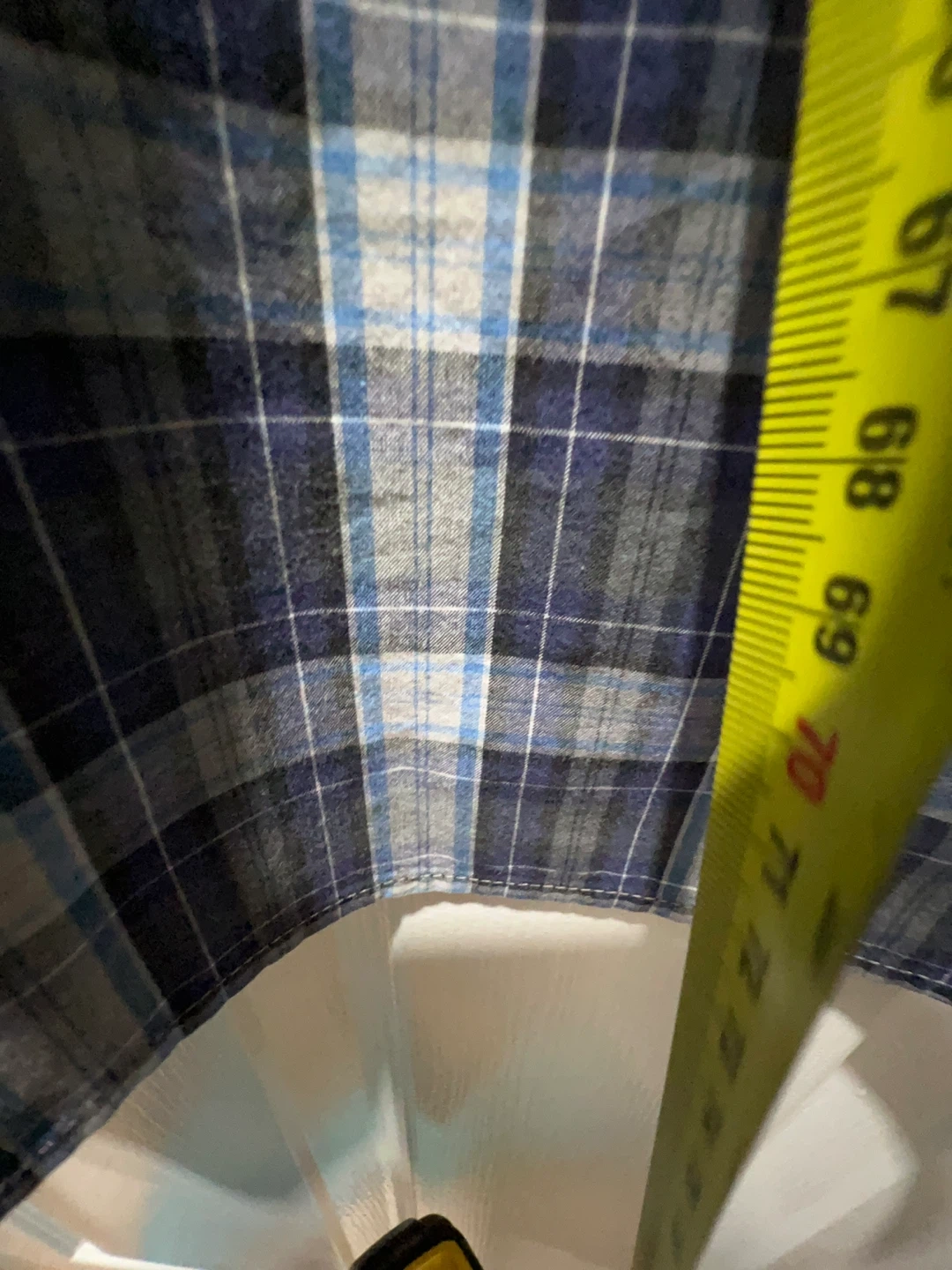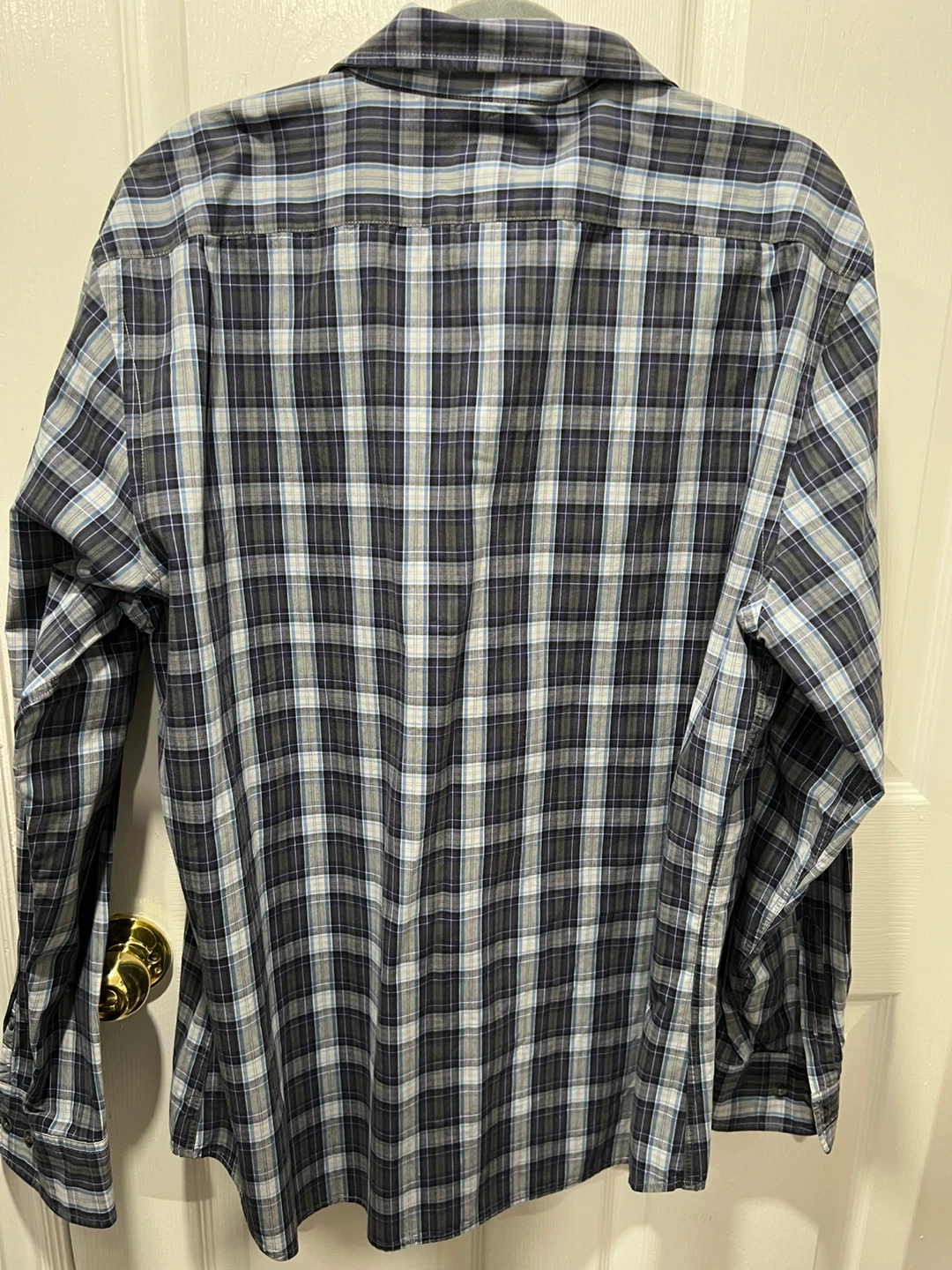 Men's GAP long-sleeve button-up shirt with a blue, grey, and white plaid pattern. It's a size XL. Great for casual wear!