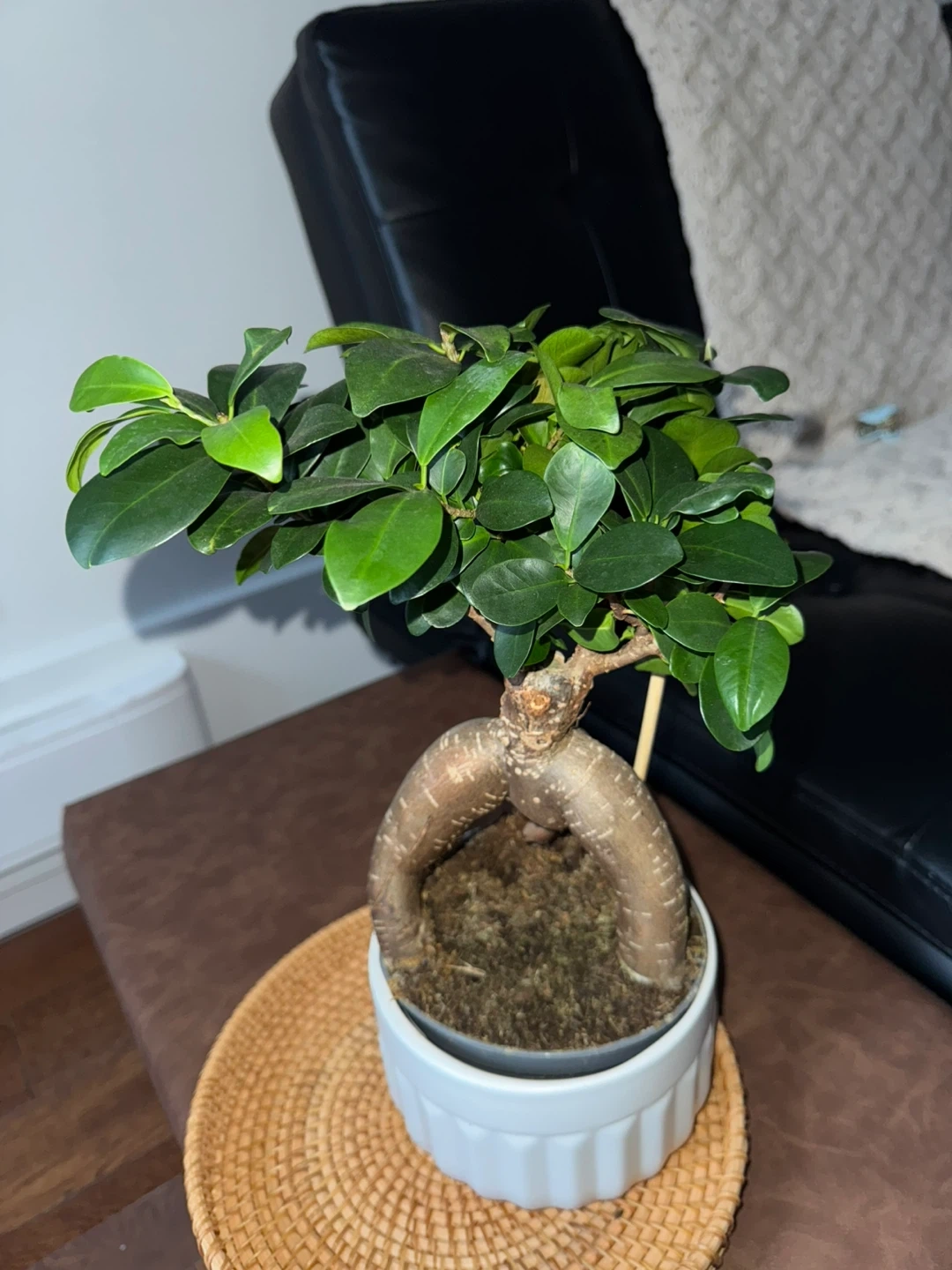 It's potted in a white ceramic planter with a decorative woven tray. It's a unique houseplant with eye-catching aerial