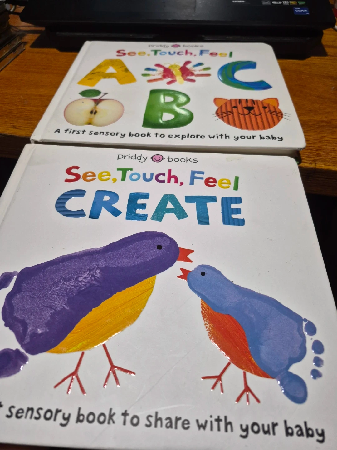 Four interactive board books perfect for little ones. Includes 'Farm Animals,' 'See, Touch, Feel CREATE,' 'See, Touch, Feel ABC,' and 'Rover the Junkyard Dog.' These books are designed for sensory exploration and early learning.