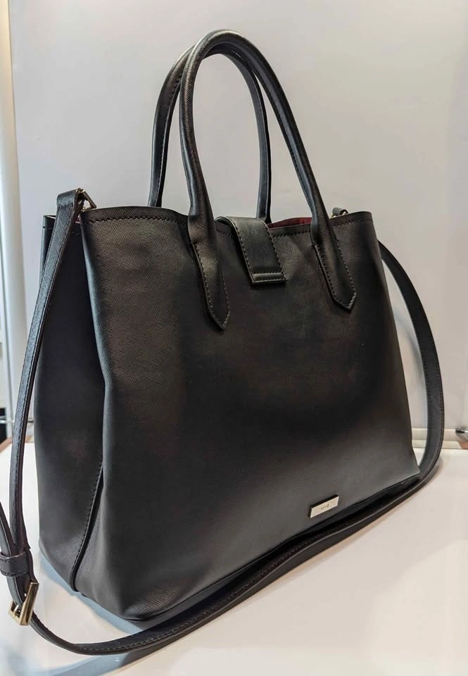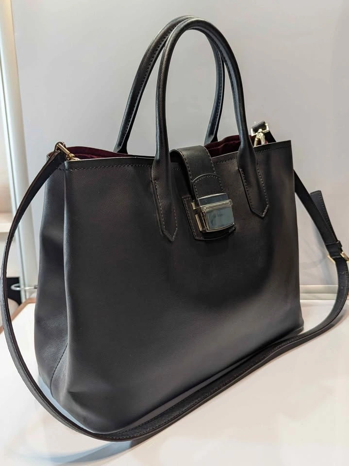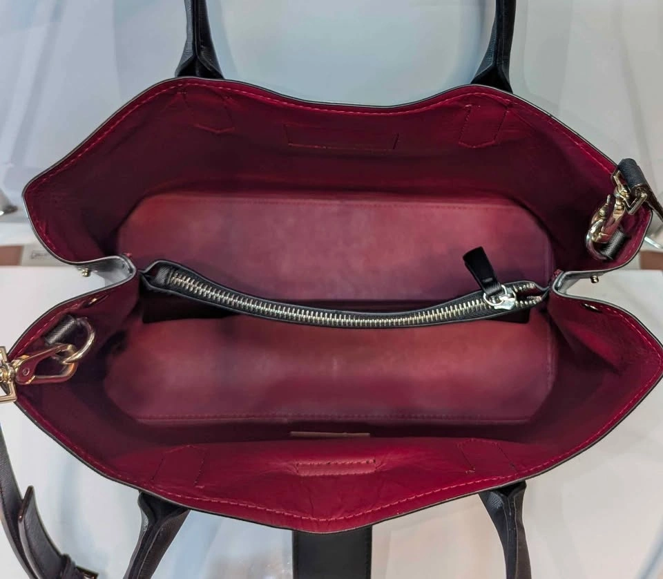 The interior is thoughtfully designed with a striking burgundy lining and a central zippered compartment to keep your essentials organized and secure. It offers ultimate versatility, allowing you to carry it by the elegant top handles or use the adjustable, detachable strap for a hands-free crossbody style.