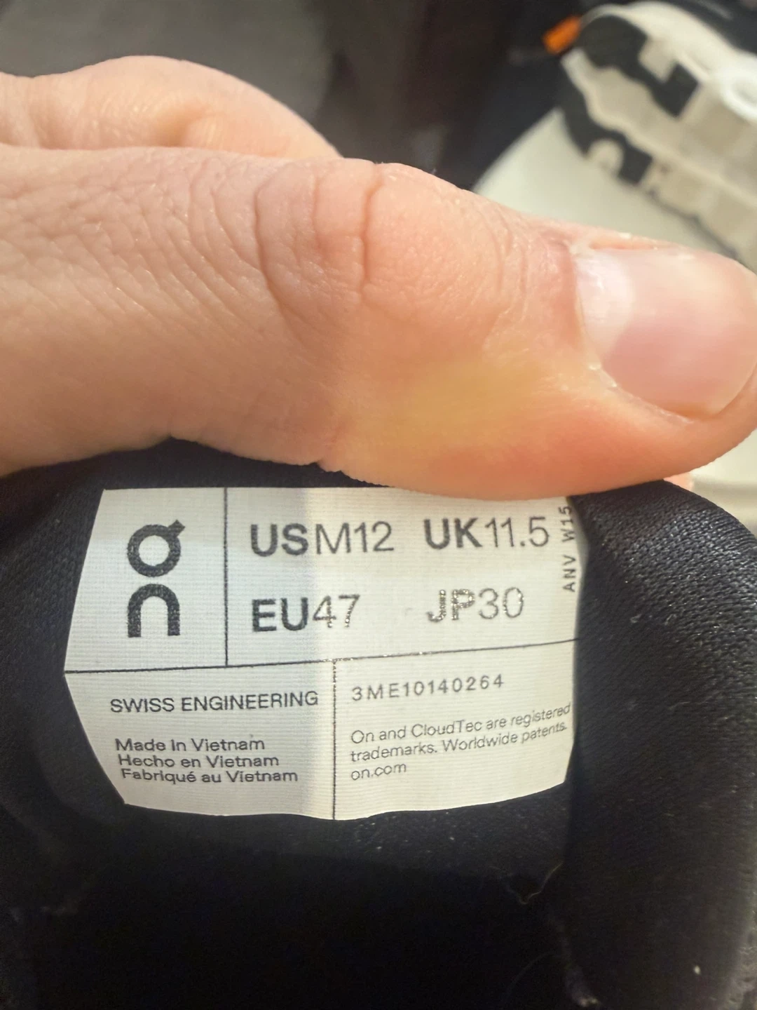 These ON Running Cloudrunner shoes are a size US Men's 12 (UK 11.5, EU 47, JP 30). They're black with white soles and are made in Vietnam. These are great for running or everyday wear!
