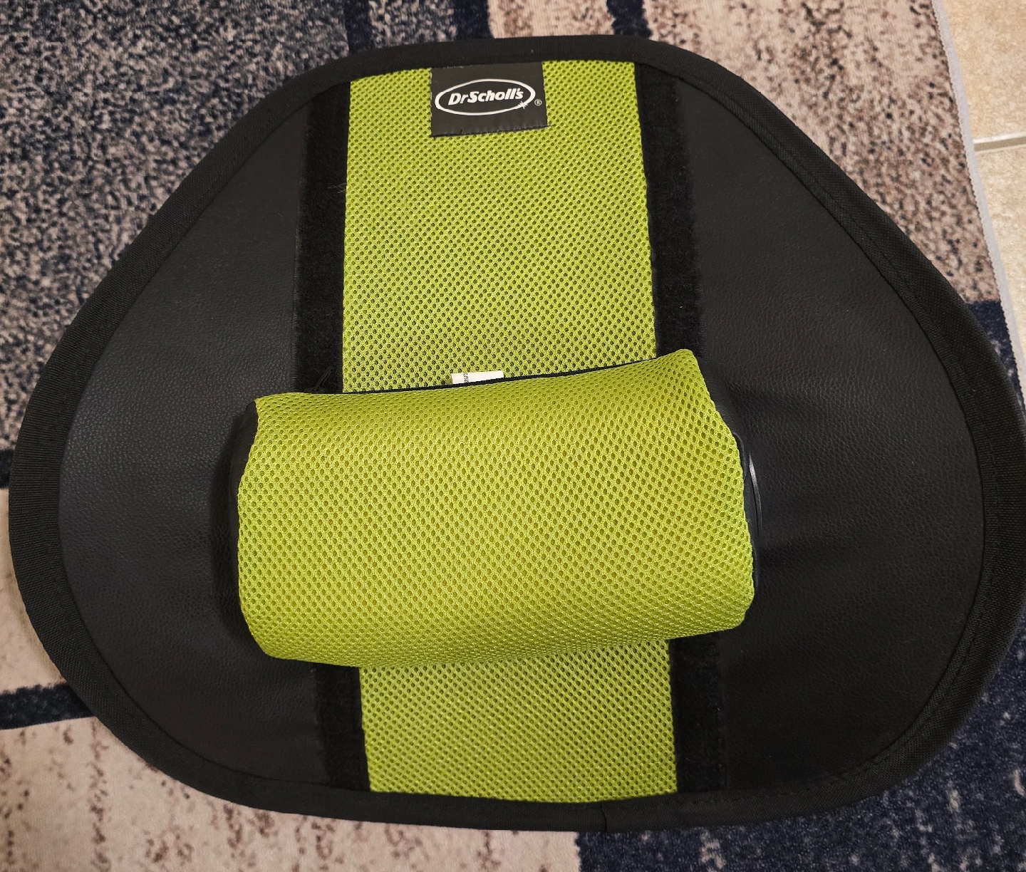 Here's a Dr. Scholl's back massager seat cushion! It's black and green and has an adjustable lumbar support. It also has massage settings to help you relax while you drive or sit at your desk