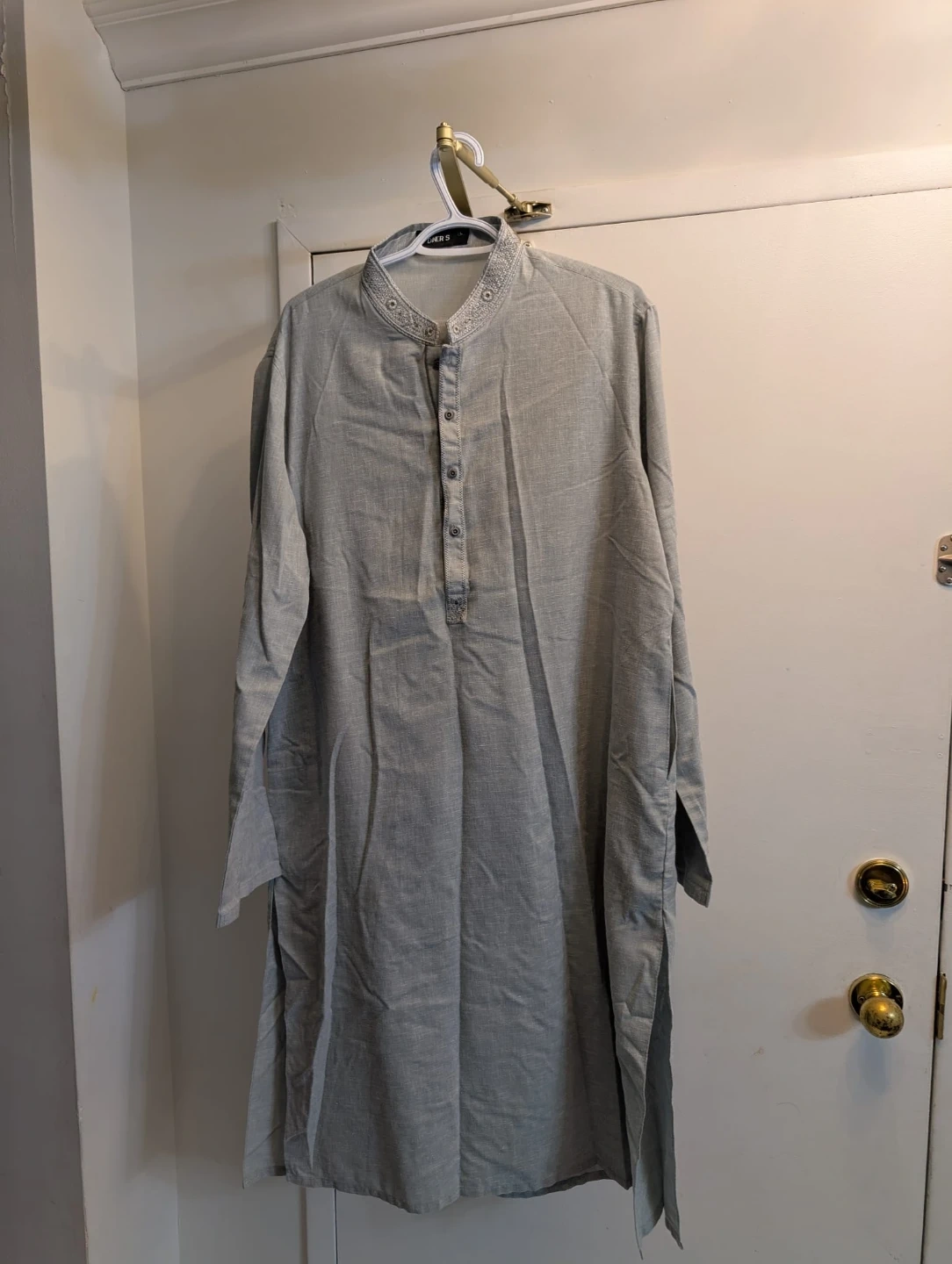 Light grey shalwar kameez with a mandarin collar and button-up placket. It features embroidered details around the neckline. Made from a linen-blend fabric for breathability.