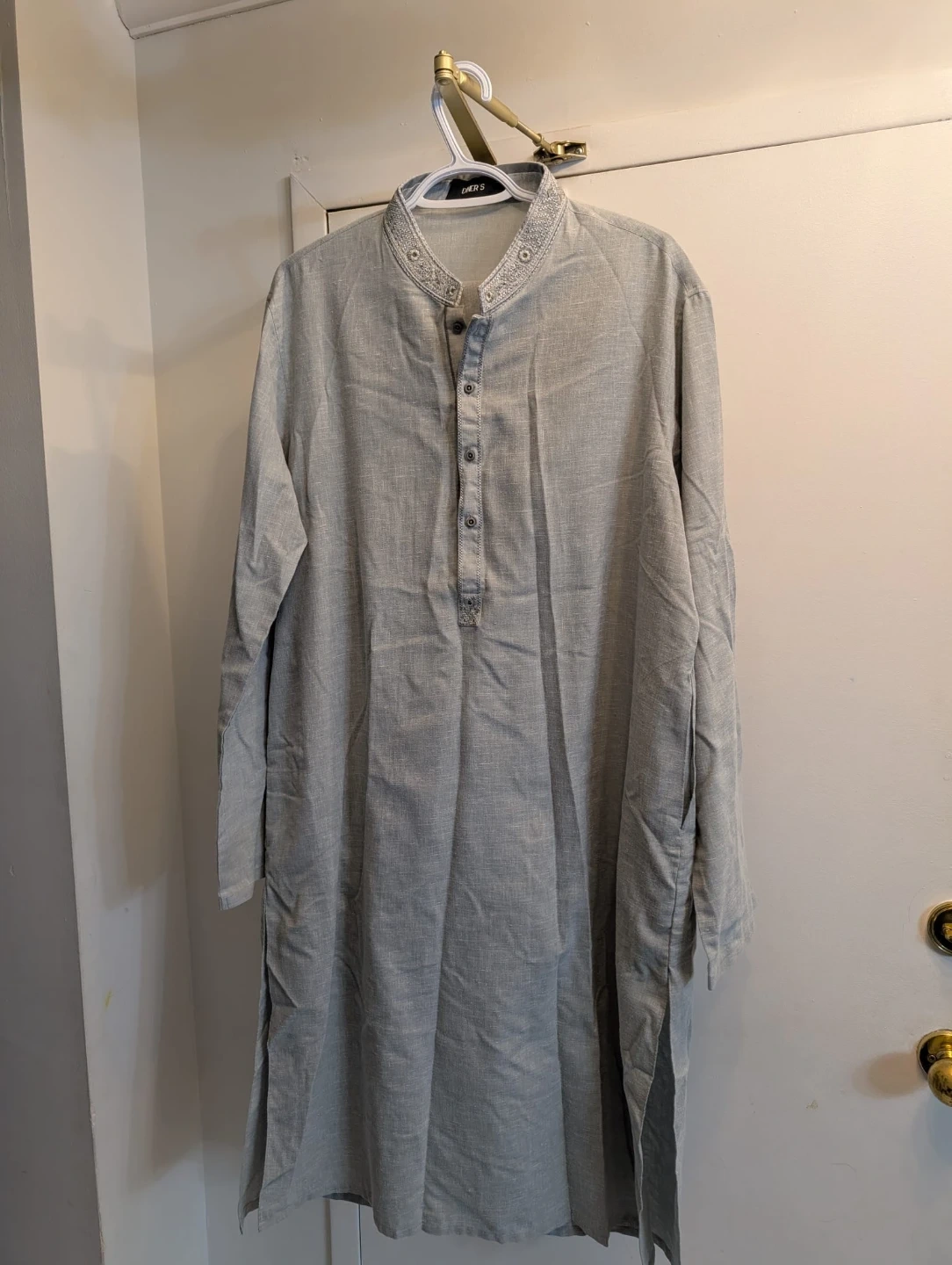 Light grey shalwar kameez with a mandarin collar and button-up placket. It features embroidered details around the neckline. Made from a linen-blend fabric for breathability.