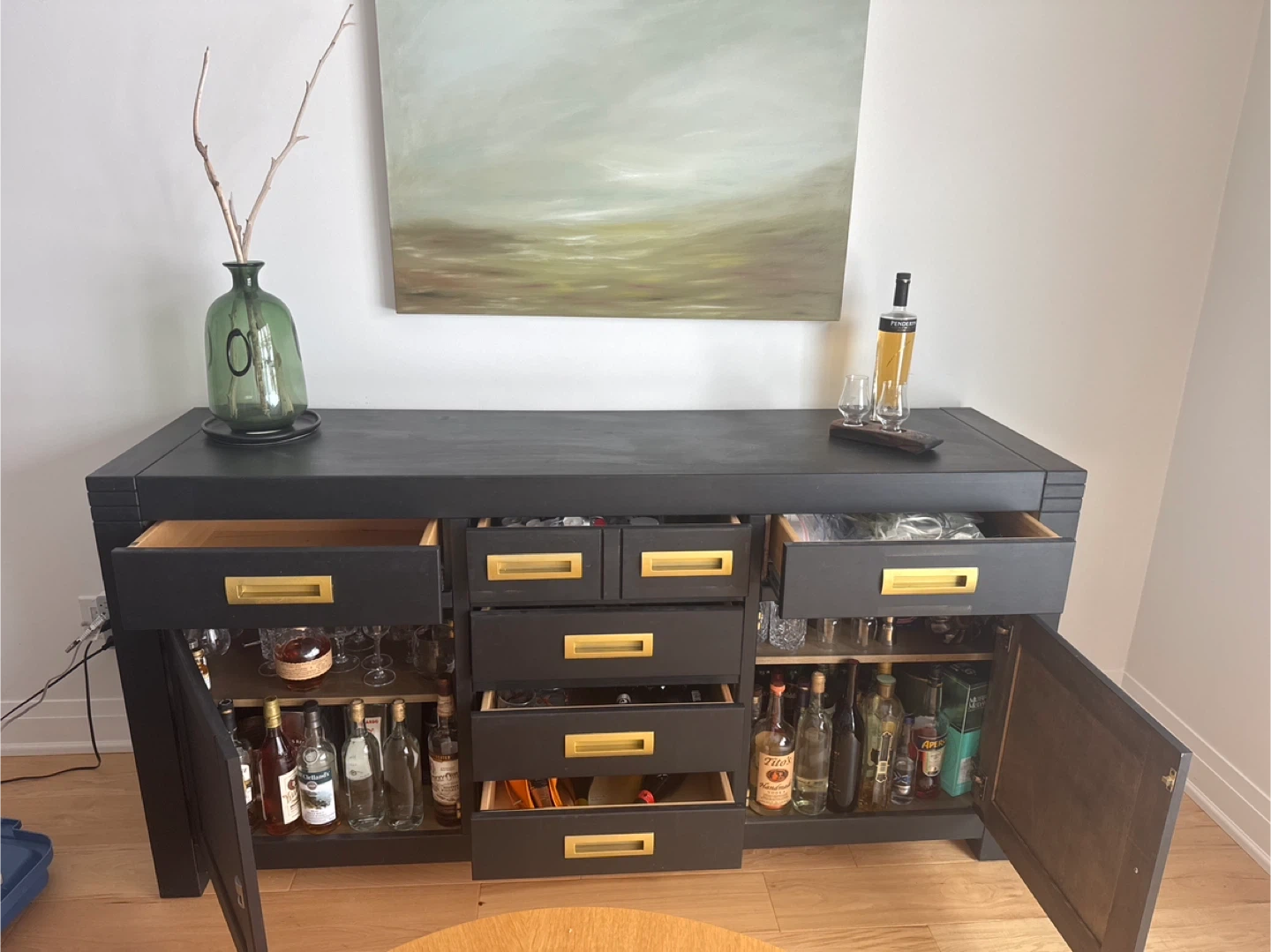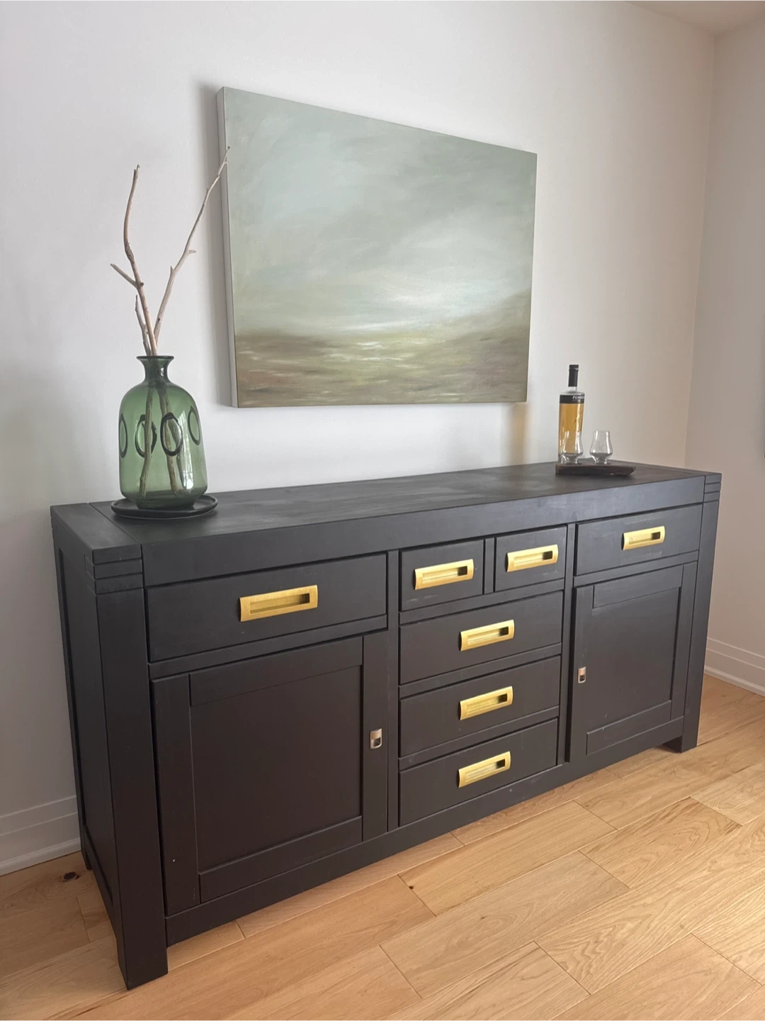 This dark wood sideboard features gold-toned drawer pulls and cabinet handles. It offers ample storage with multiple drawers and cabinets, perfect for dining room or living room use. Its sleek design complements modern and traditional decor.