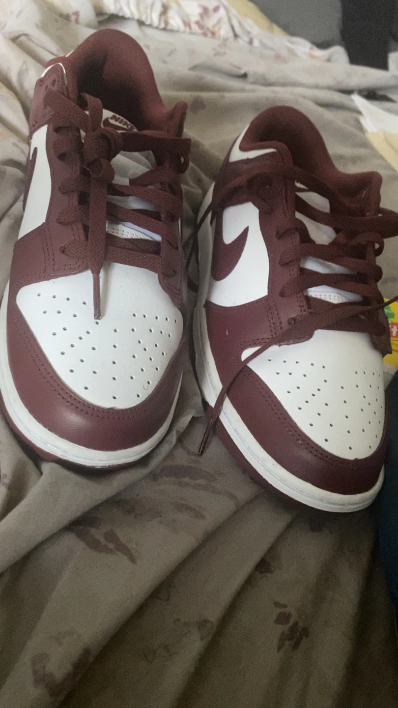 Nike Dunk Low sneakers. Burgundy and white colorway. Includes original laces. Nike branding on tongue and heel.