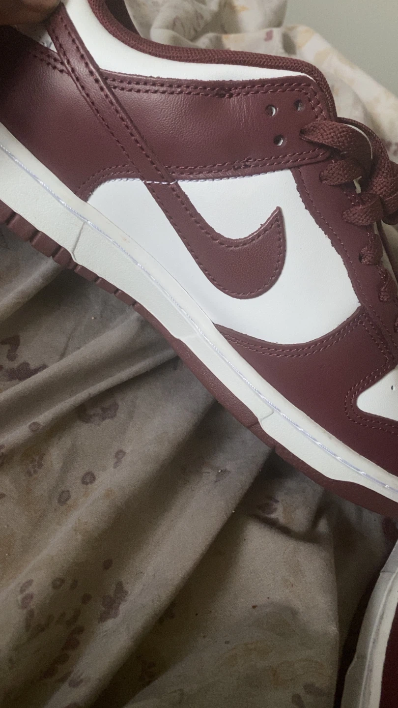 Nike Dunk Low sneakers. Burgundy and white colorway. Includes original laces. Nike branding on tongue and heel.