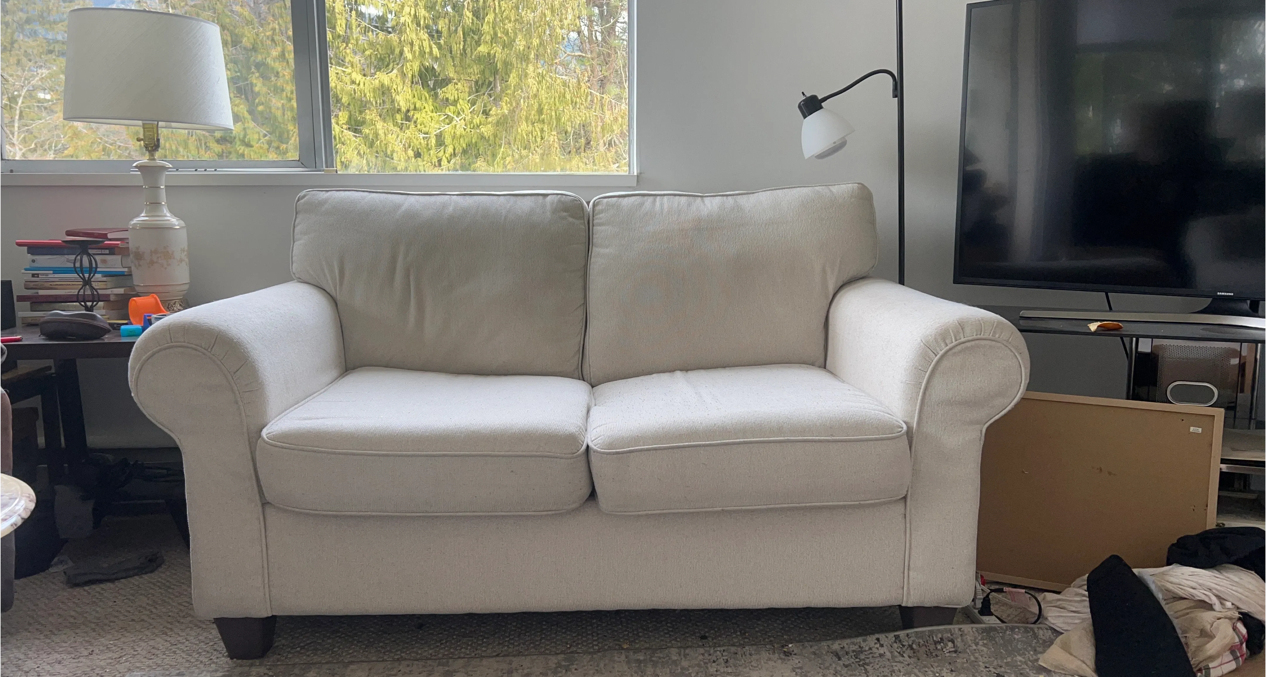 Cozy cream-coloured loveseat with fabric upholstery. Perfect size for smaller living rooms or apartments. Purchased from The Brick two years ago.