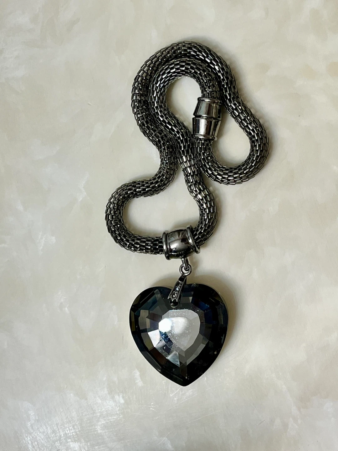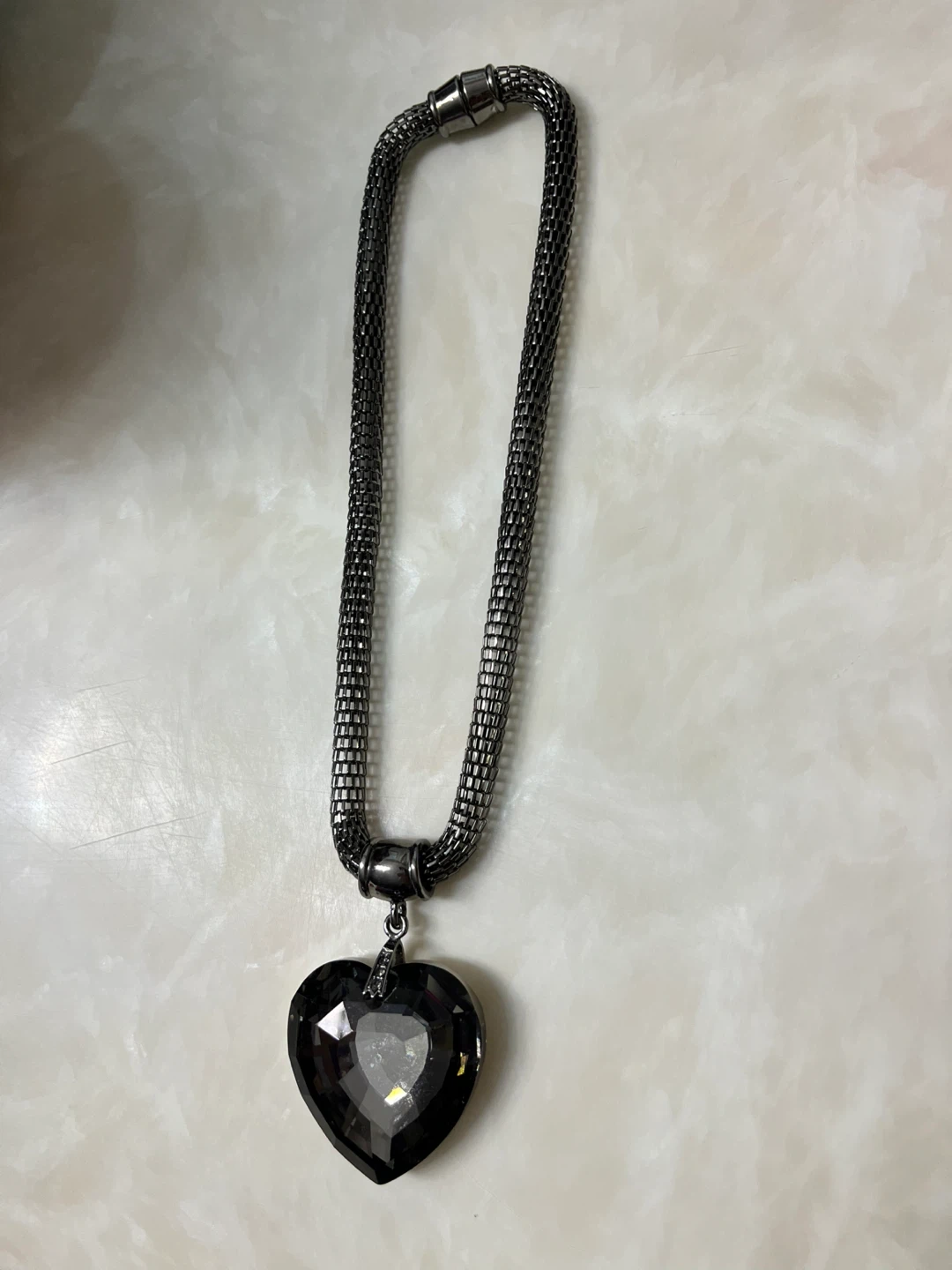 This necklace features a large, dark grey, faceted heart-shaped pendant. The chain is a gunmetal-coloured mesh style. It's a statement piece for any outfit!