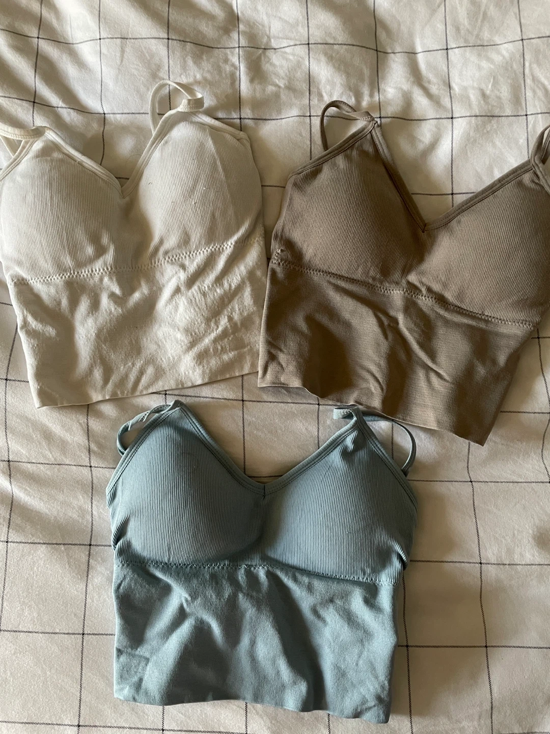 Set of three ribbed crop tank tops in white, taupe, and light blue. Padded with bra inserts. Made from 88% nylon and 12% elastane. Size XS.