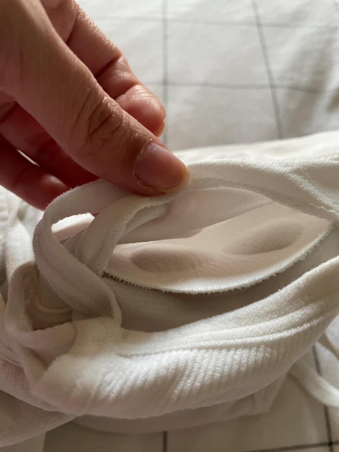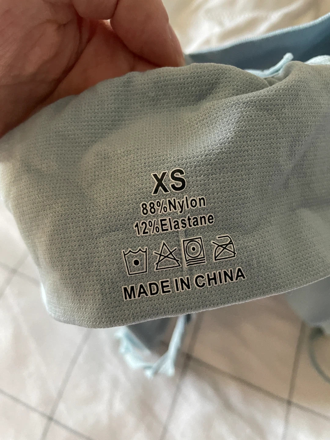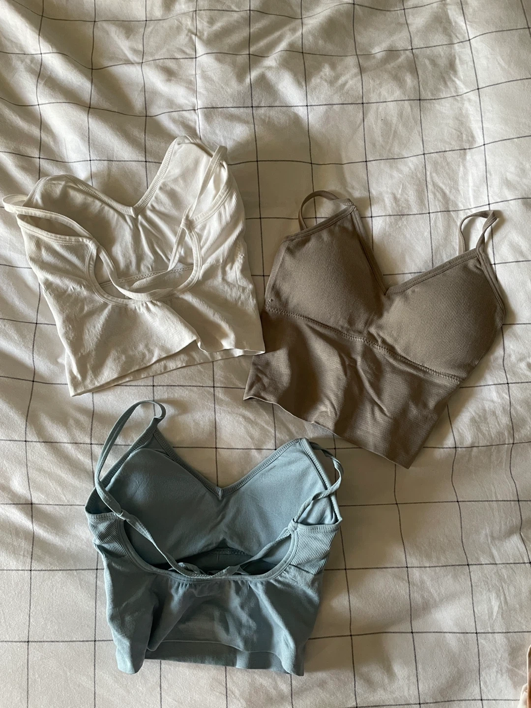Set of three ribbed crop tank tops in white, taupe, and light blue. Padded with bra inserts. Made from 88% nylon and 12% elastane. Size XS.