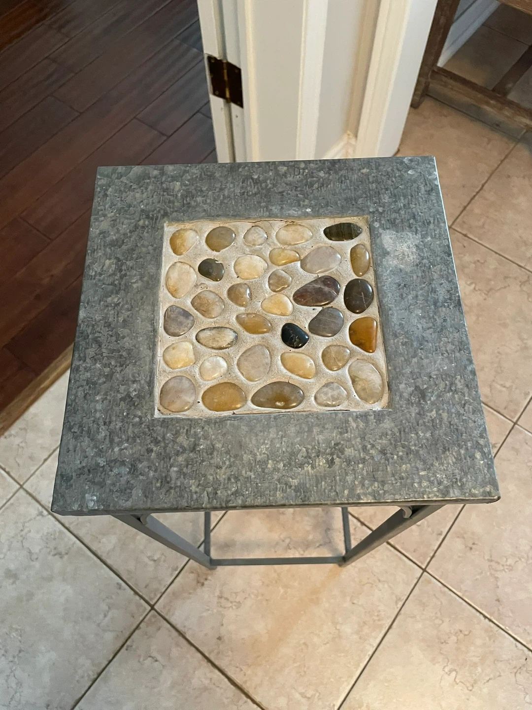 This accent table features a galvanized metal top with a decorative inset of smooth, polished river stones. The base is made of dark metal with a curved support. It's a lovely piece for displaying plants or decor.