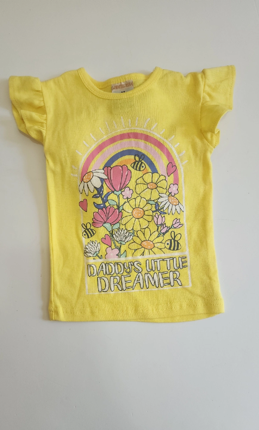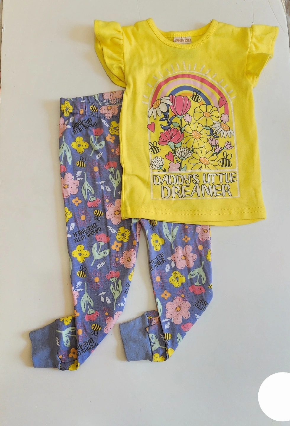 Cute girls' pajama set with a yellow top and floral print pants! The top features a colorful design with flowers, bees, and the words "Daddy's Little Dreamer"