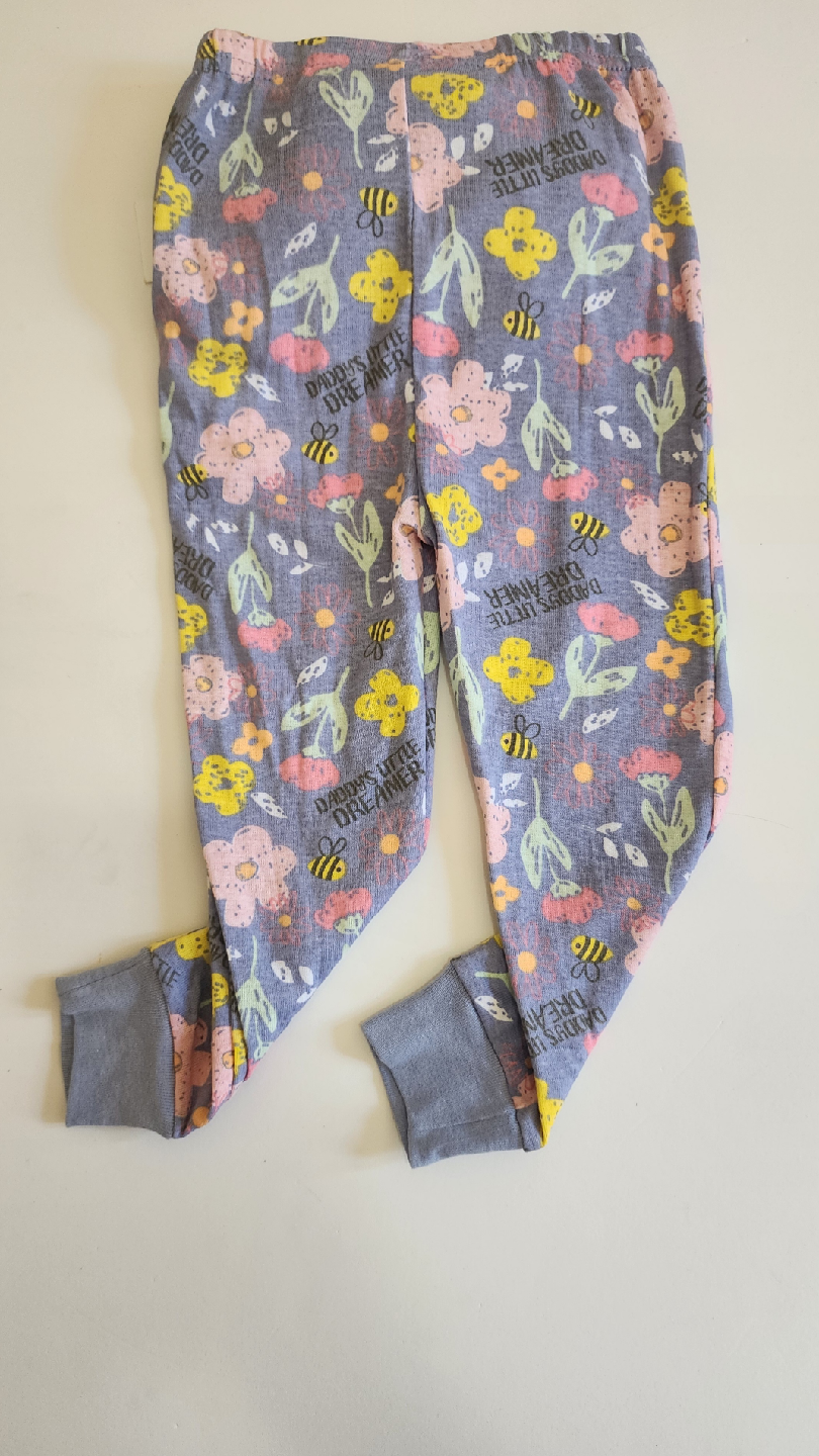 Cute girls' pajama set with a yellow top and floral print pants! The top features a colorful design with flowers, bees, and the words "Daddy's Little Dreamer"