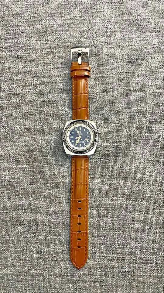 Vintage Mortima automatic watch with 17 jewels movement and world time rotating bezel. Stainless steel case back features diver engraving. Blue dial with luminous markers and date window at 4 o'clock. Dual crowns control time and internal bezel functions. Serviced in 2023 with a new genuine leather band (18mm, alligator grain). Watch has been left unpolished.