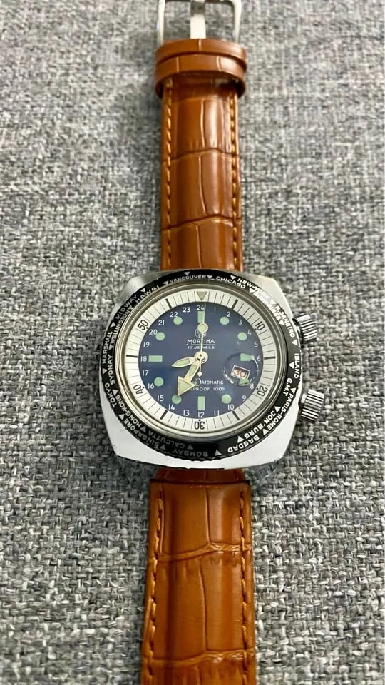 Vintage Mortima automatic watch with 17 jewels movement and world time rotating bezel. Stainless steel case back features diver engraving. Blue dial with luminous markers and date window at 4 o'clock. Dual crowns control time and internal bezel functions. Serviced in 2023 with a new genuine leather band (18mm, alligator grain). Watch has been left unpolished.