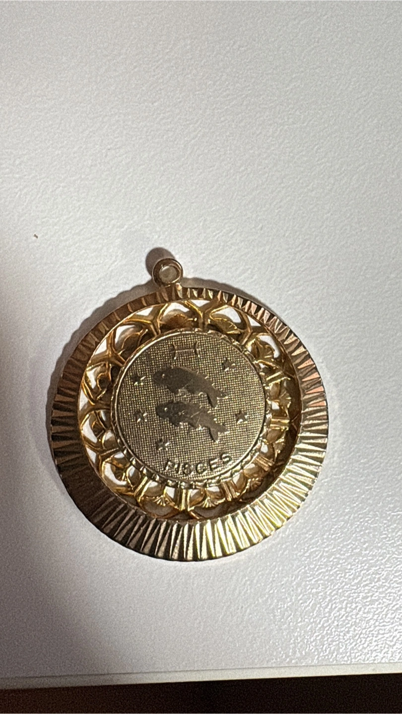 Selling a vintage gold-tone pendant featuring the Pisces zodiac sign. It has a unique, intricate design. Perfect for anyone who loves astrology or vintage jewelry!