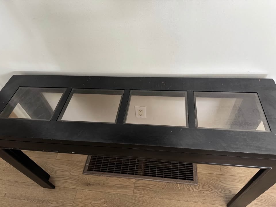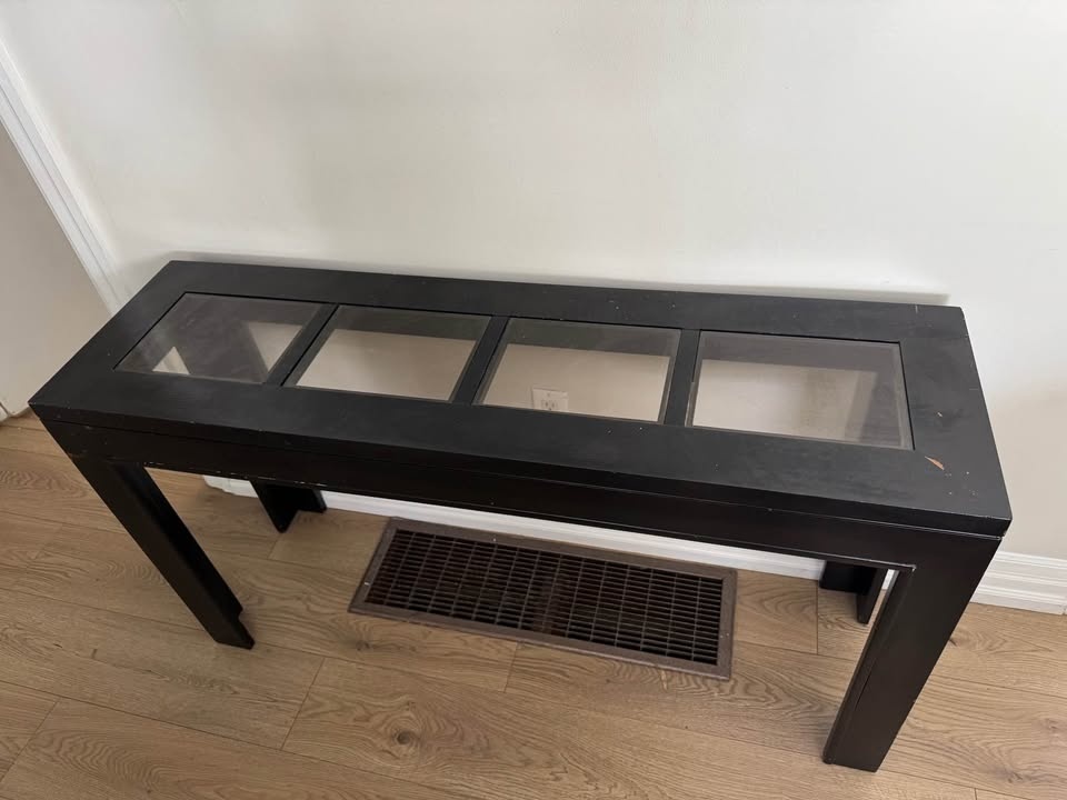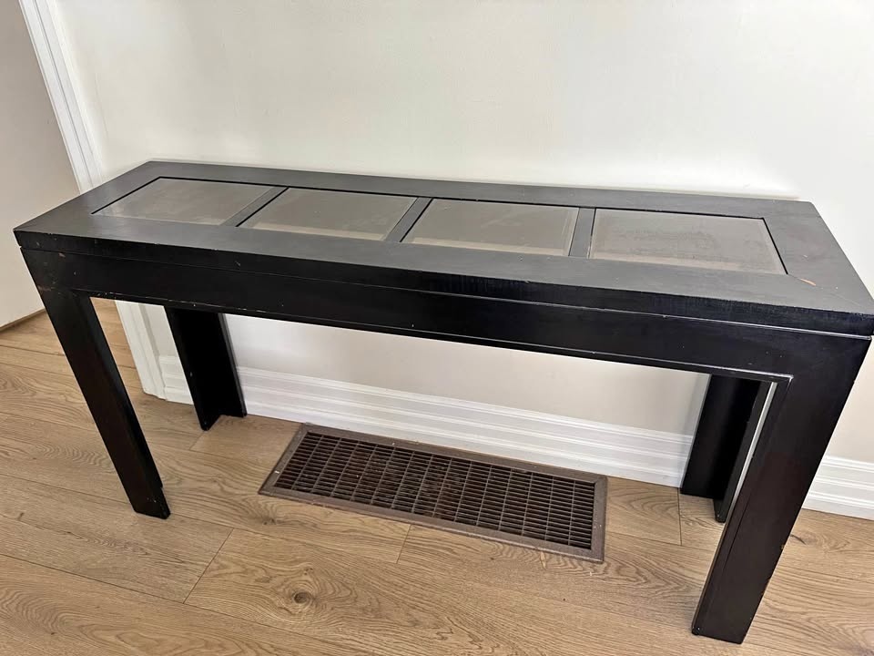 Console Table with detachable glass inserts. In good condition, very sturdy. Minor paint chips as seen in the pictures. Pickup only at 1155 Commissioners Rd E, London.