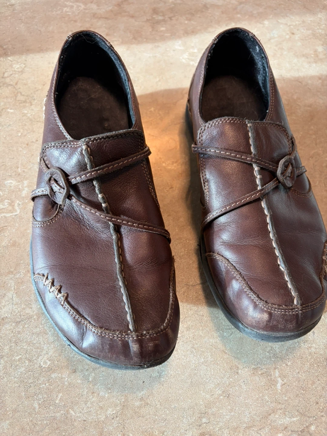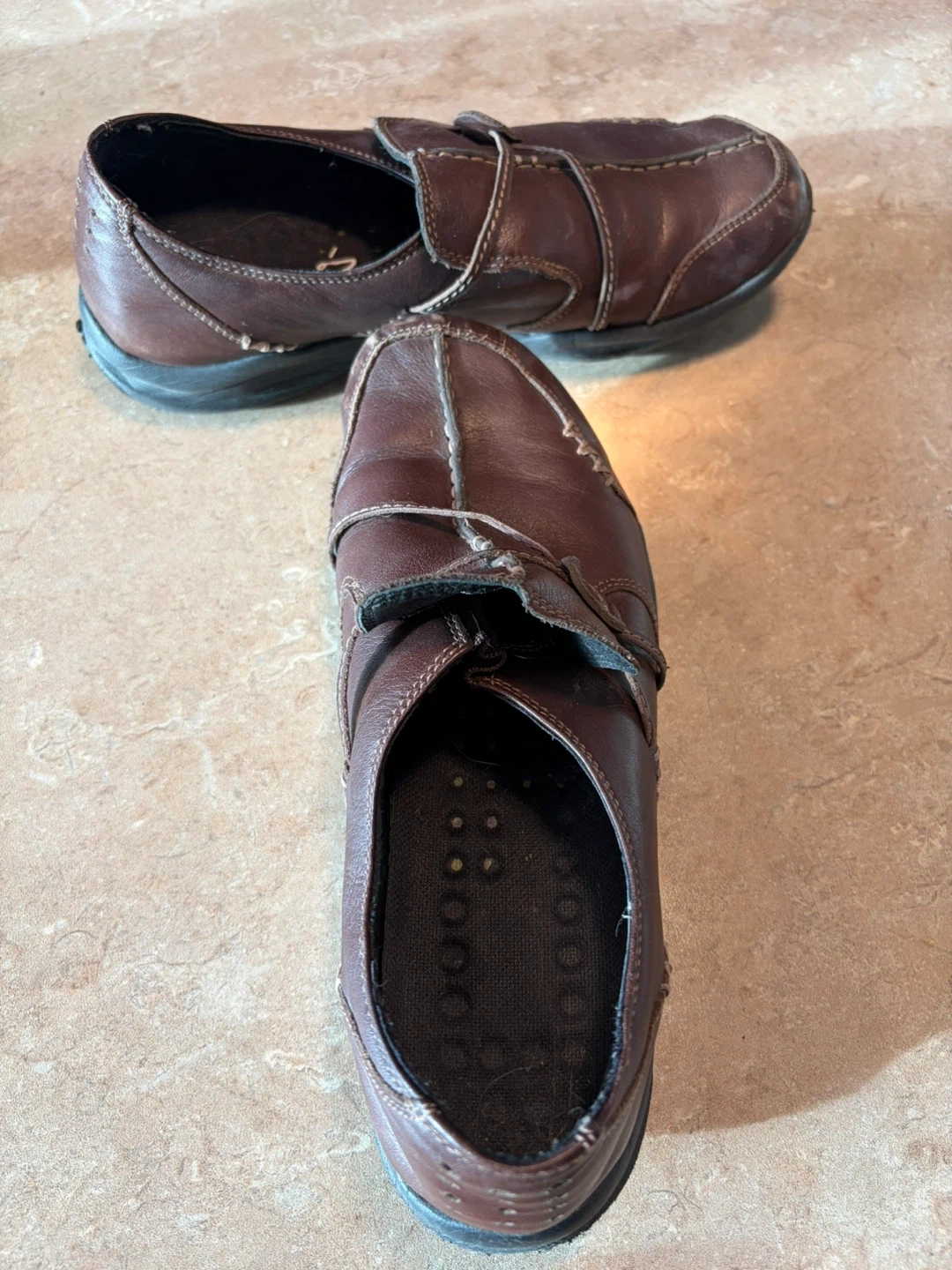 Comfortable brown leather slip-on shoes. Features a secure strap closure and a cushioned footbed. Made with durable leather. Great for walking!