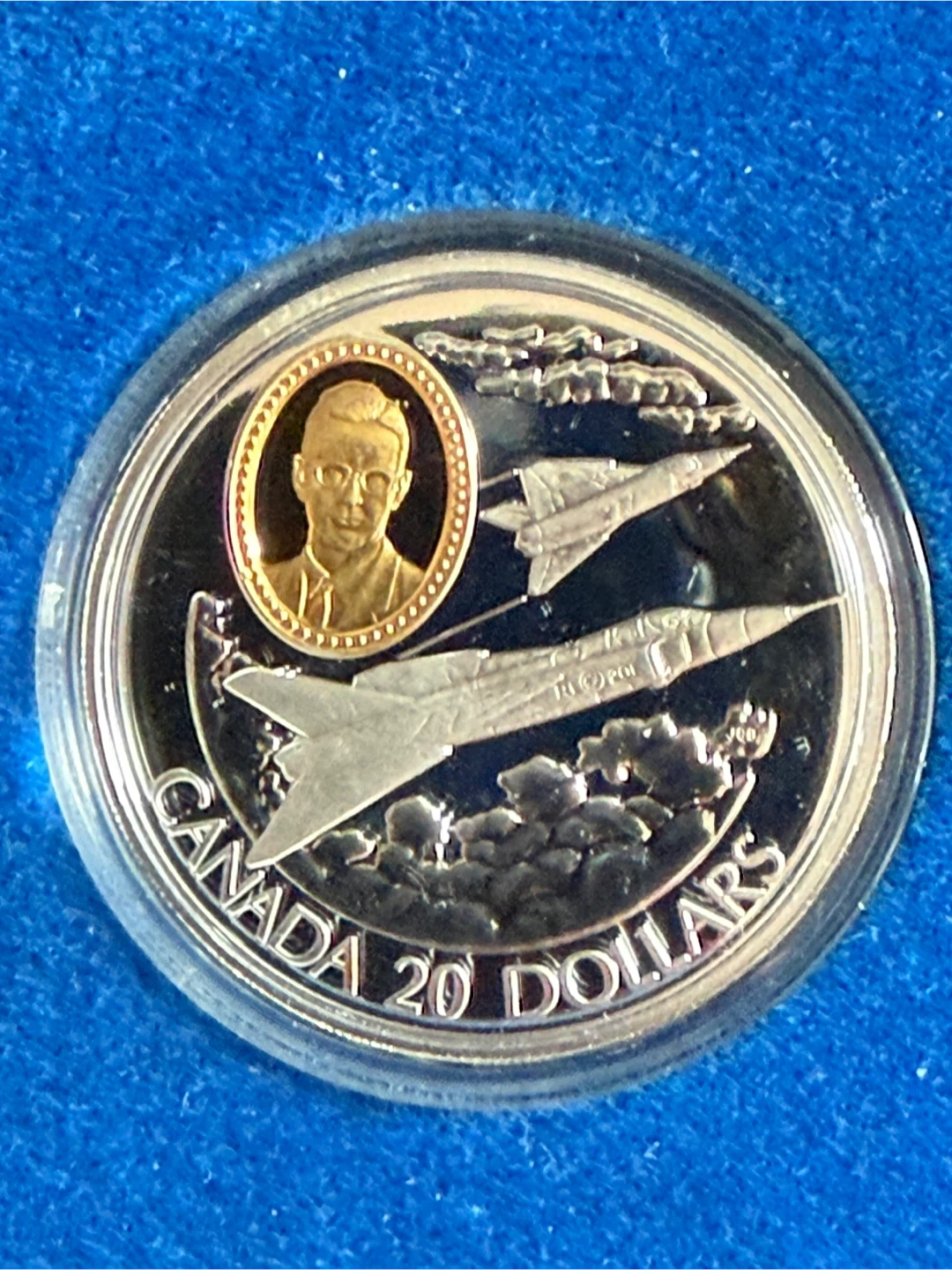 A commemorative $20 coin featuring the Avro Canada CF-105 Arrow aircraft. It's struck in Canada and celebrates powered flight. This coin includes a small portrait in the centre. It’s sterling silver ,24 karat gold cover cameo . In original box + c