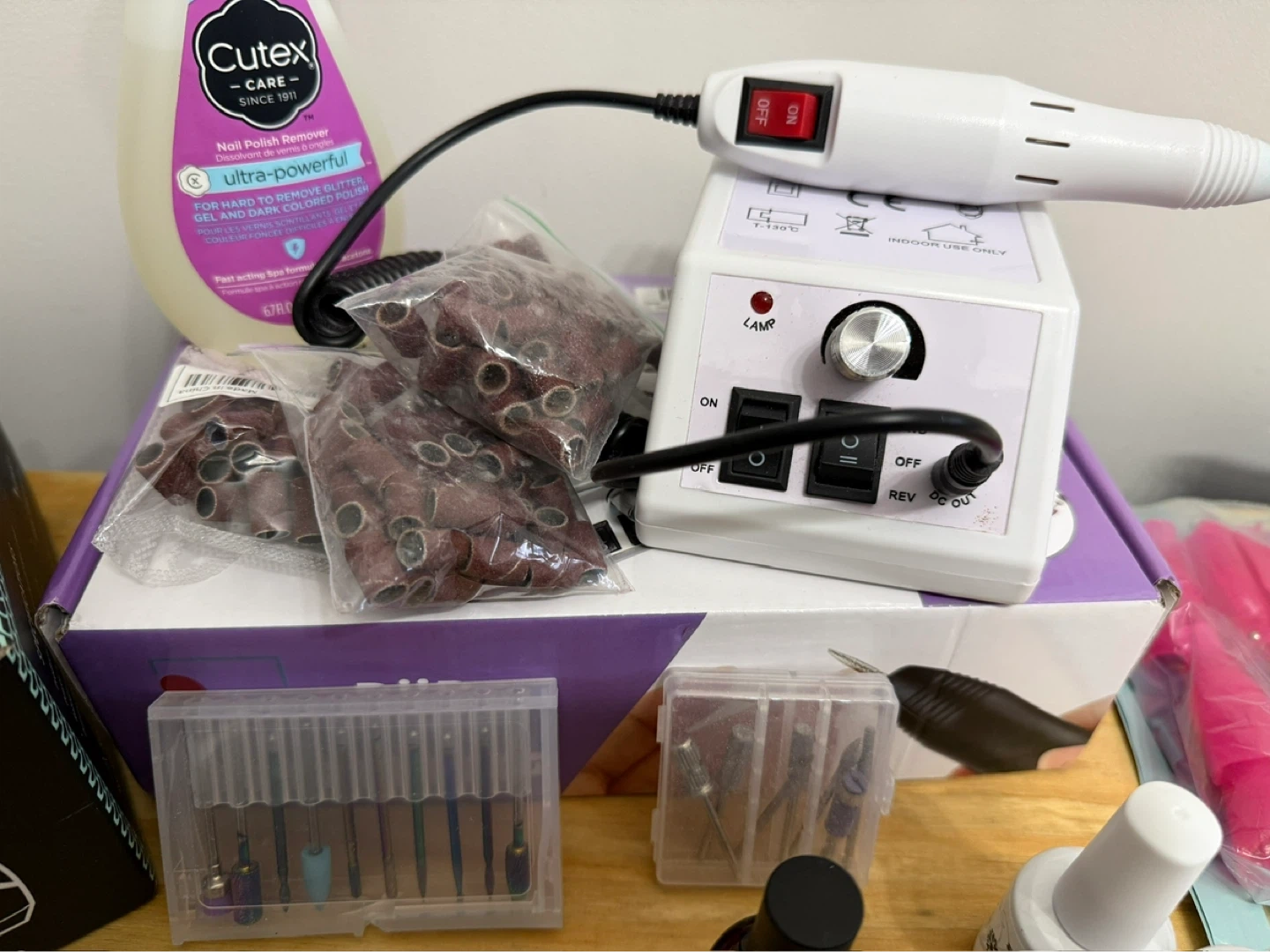 This electric nail file machine comes with multiple bits and sanding bands. It also includes a bottle of Cutex ultra-powerful nail polish remover. The machine has adjustable speed and direction settings.