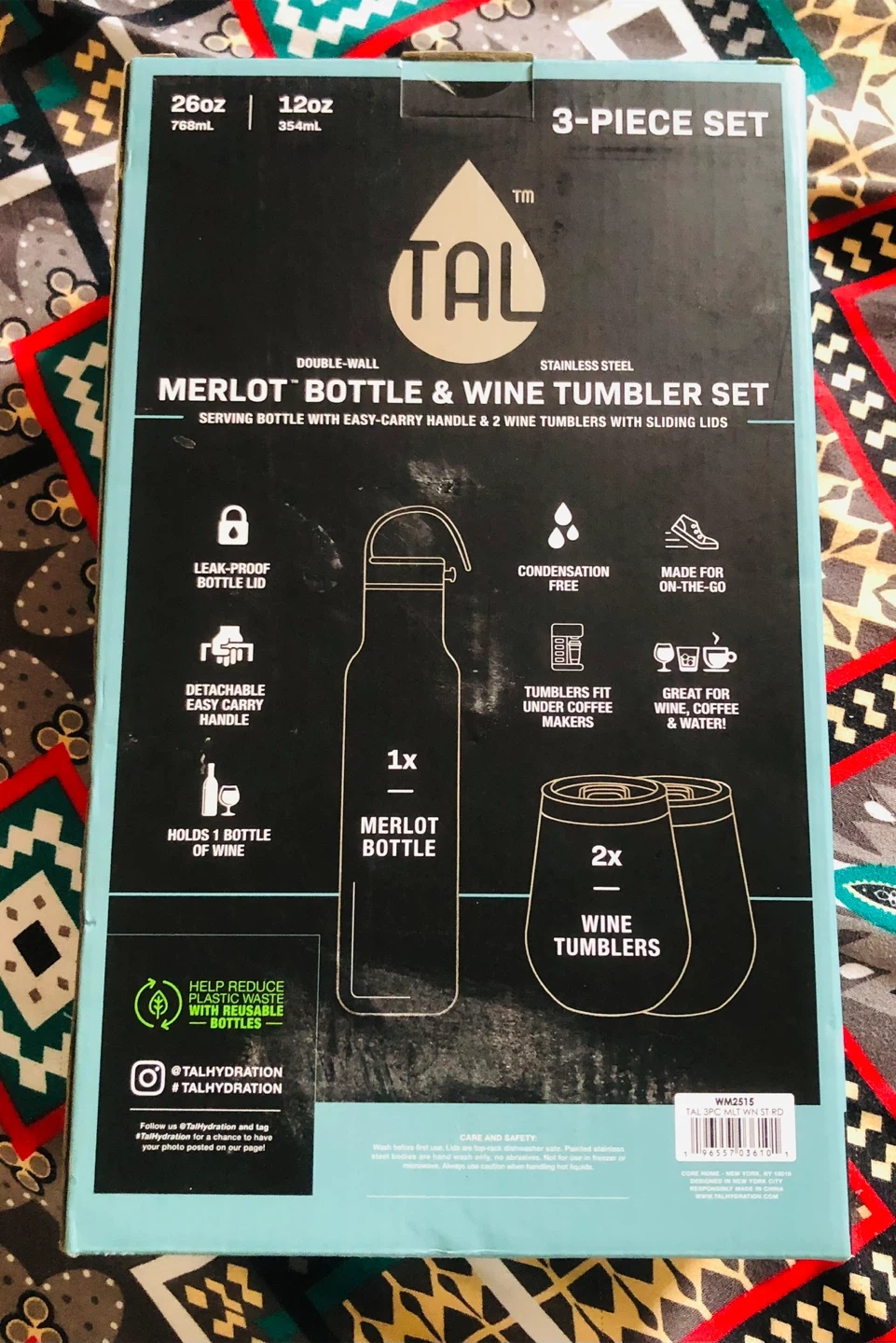 This is a TAL 3-piece set featuring a 26oz merlot bottle and two 12oz wine tumblers. Both the bottle and tumblers are double-wall insulated and made of stainless steel. They are designed to keep drinks cold for hours or hot for hours. This set is great for wine, coffee, and water!