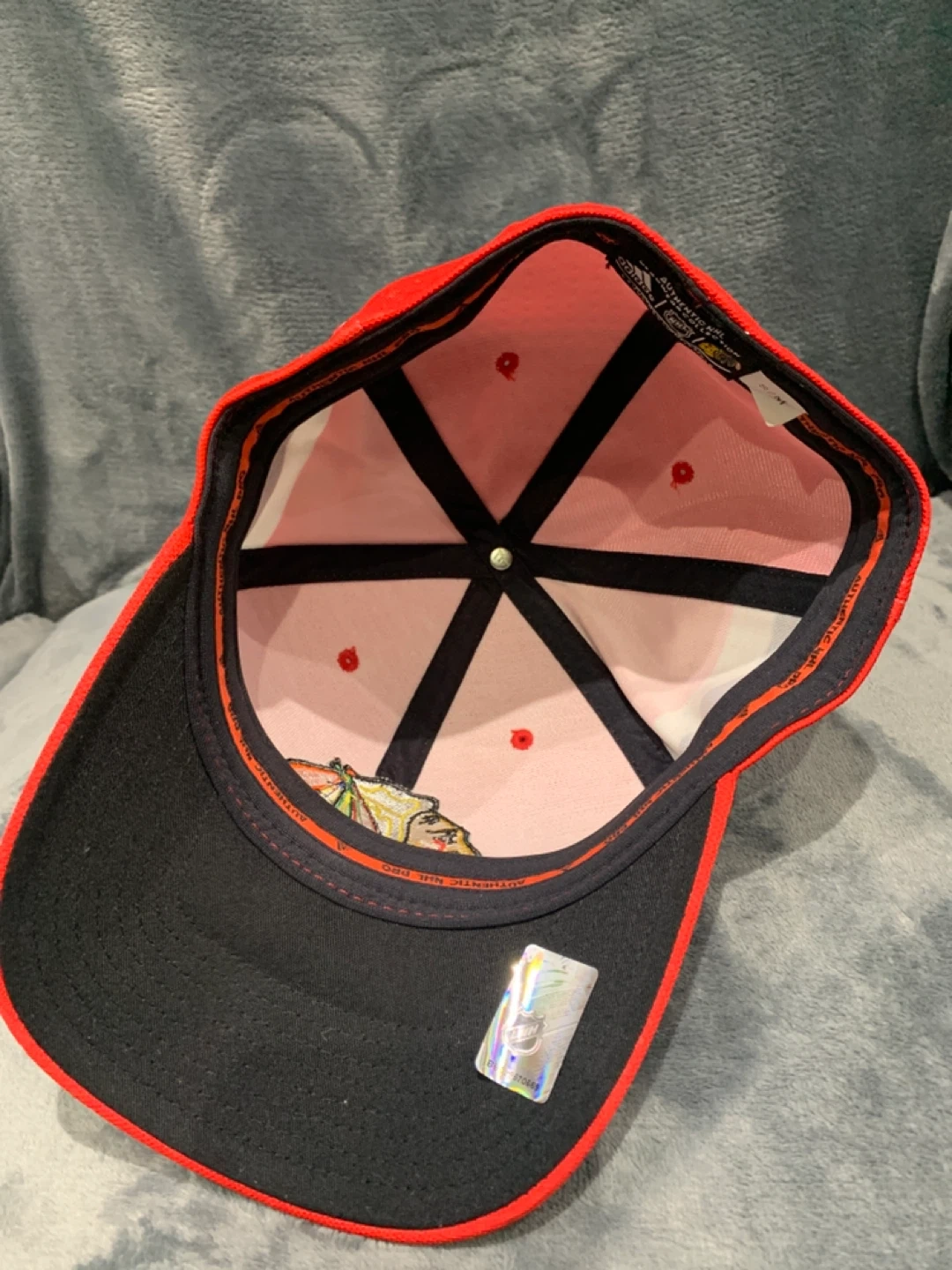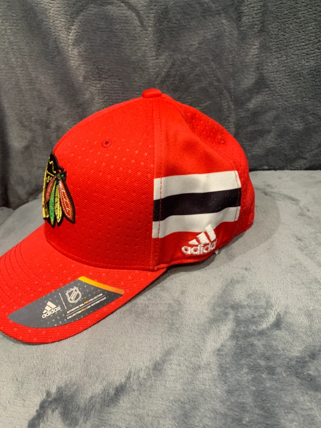 Red Adidas baseball cap featuring the Chicago Blackhawks logo. It's made with breathable material and has the Adidas logo on the side. A classic fan accessory for game day!