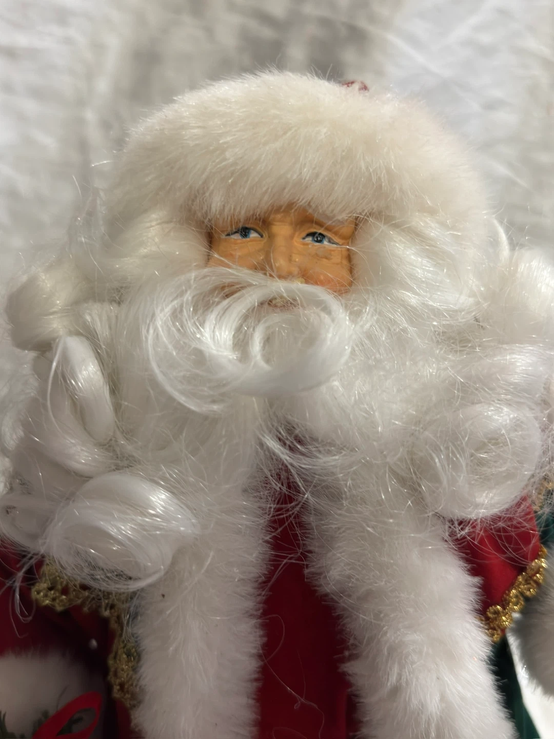 This is a decorative Santa Claus doll. It's dressed in a red and green velvet outfit with gold trim and white faux fur. The doll carries a sack with greenery and berries, and also holds a bell. A small wreath is also included.