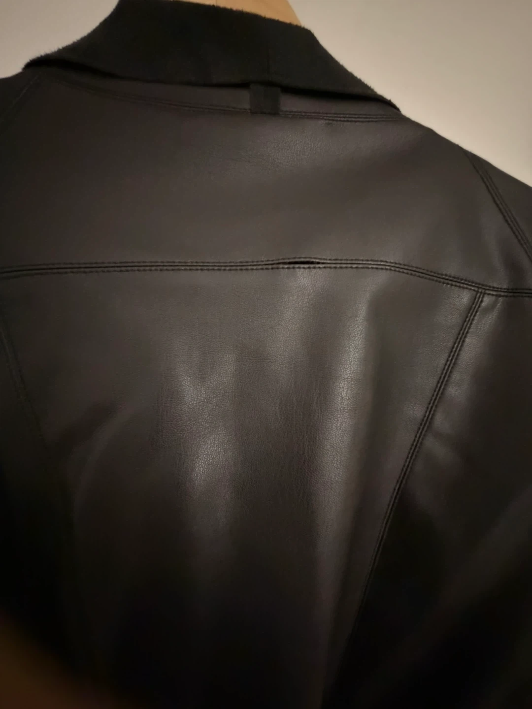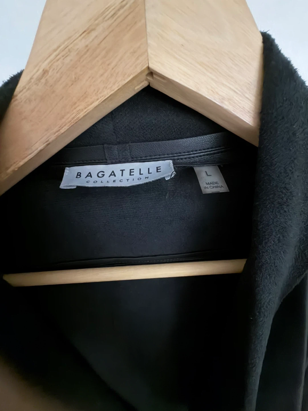 Bagatelle Collection faux leather jacket in black. It's a size L with a stylish drape front. The jacket features zippered pockets.