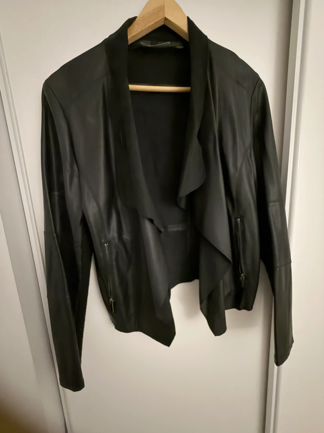 Bagatelle Collection faux leather jacket in black. It's a size L with a stylish drape front. The jacket features zippered pockets.