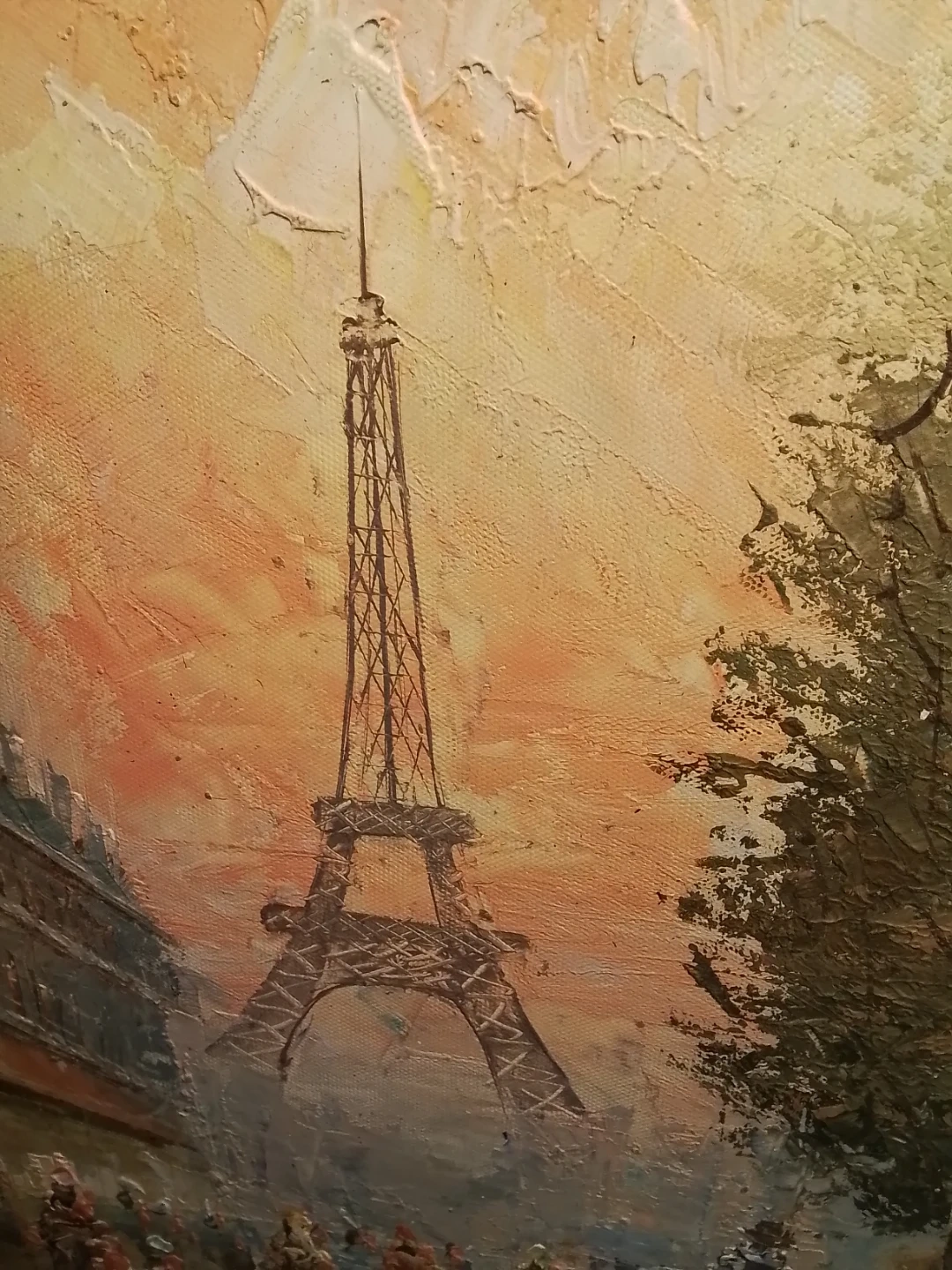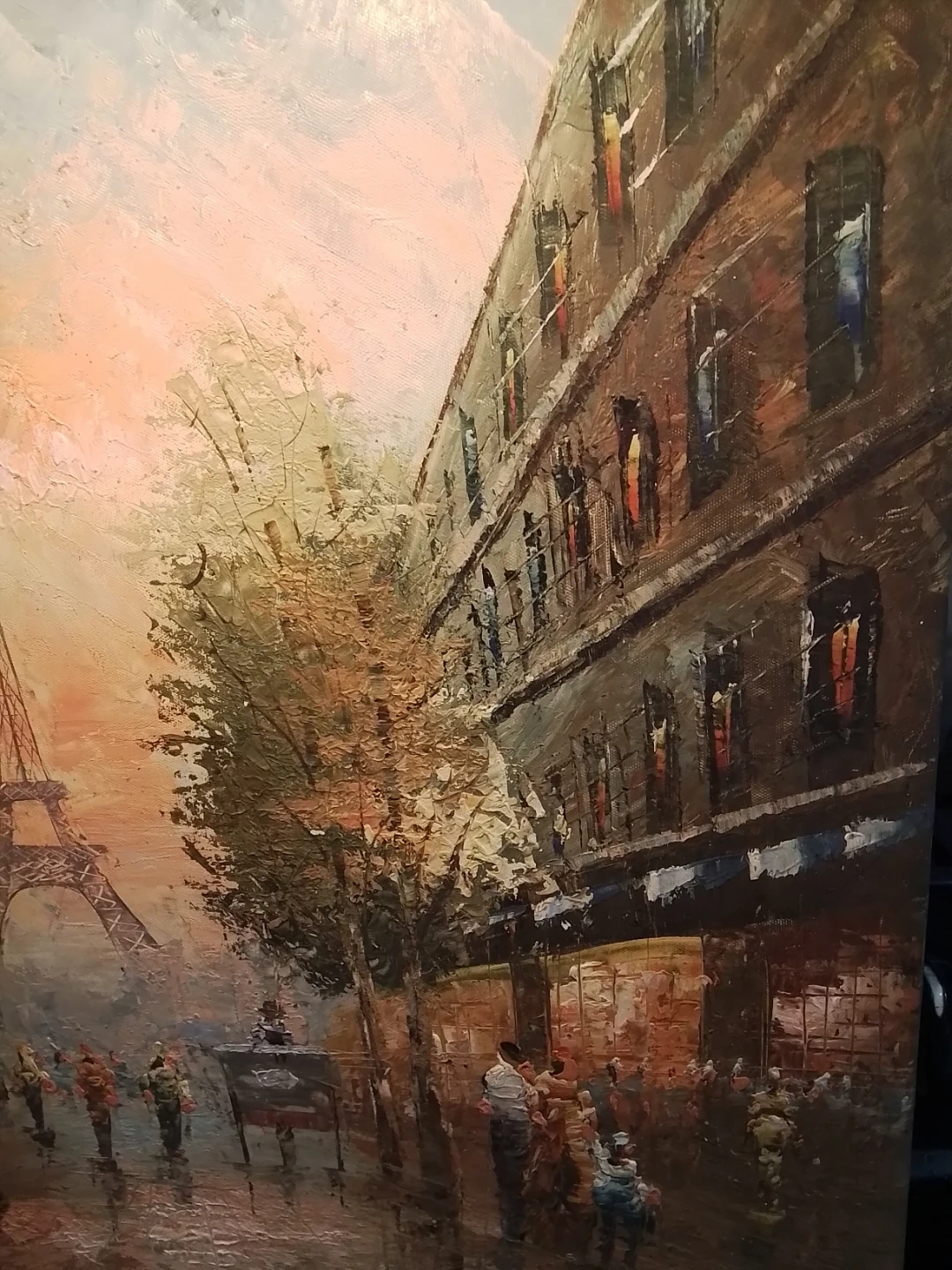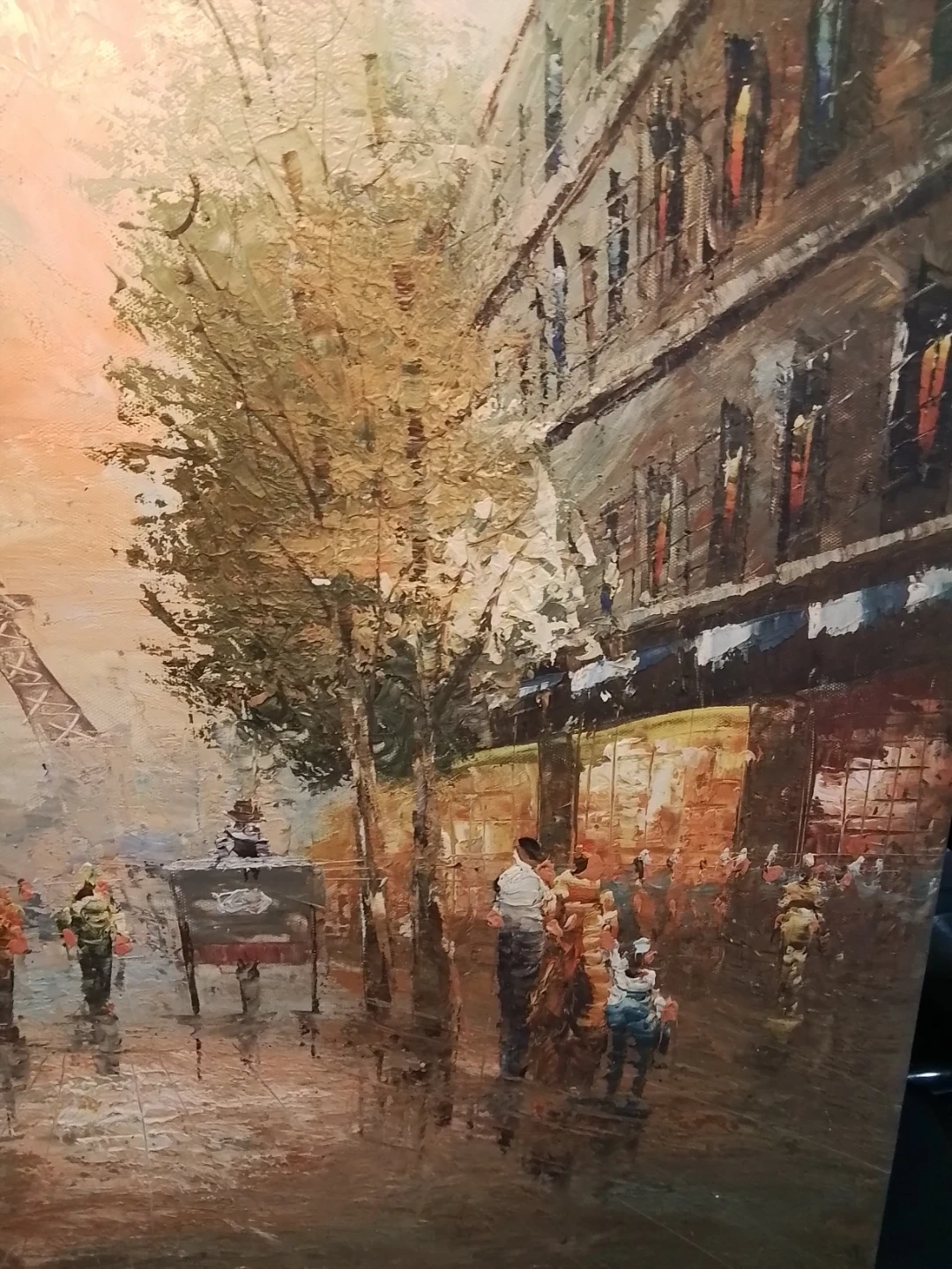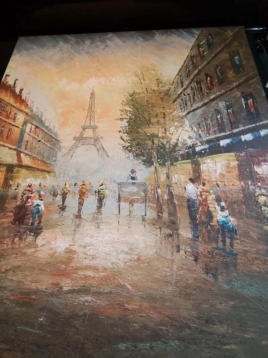 This is an oil painting depicting a street scene in Paris, with the Eiffel Tower visible in the background. The artwork features a vibrant impasto style, showing people on a street. It's painted on canvas and mounted on a wooden frame.