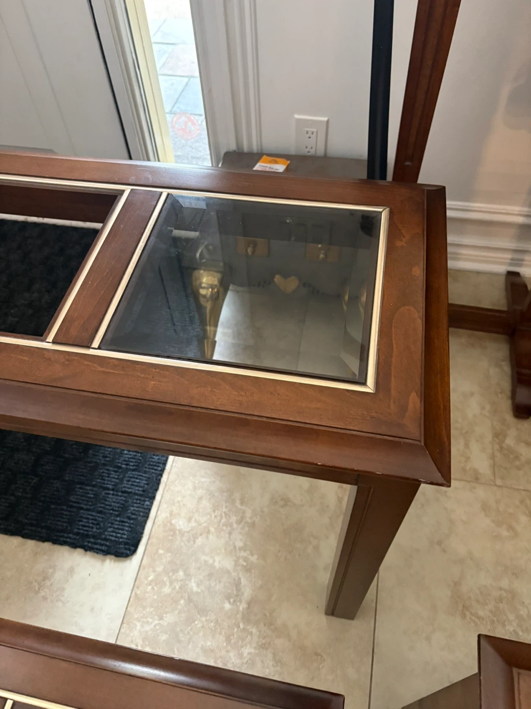 Here's a set of four wooden tables, featuring glass tops with decorative gold trim. This set includes a coffee table and three end tables. They're made of dark wood and are sturdy. This set would be great for a living room or den!
