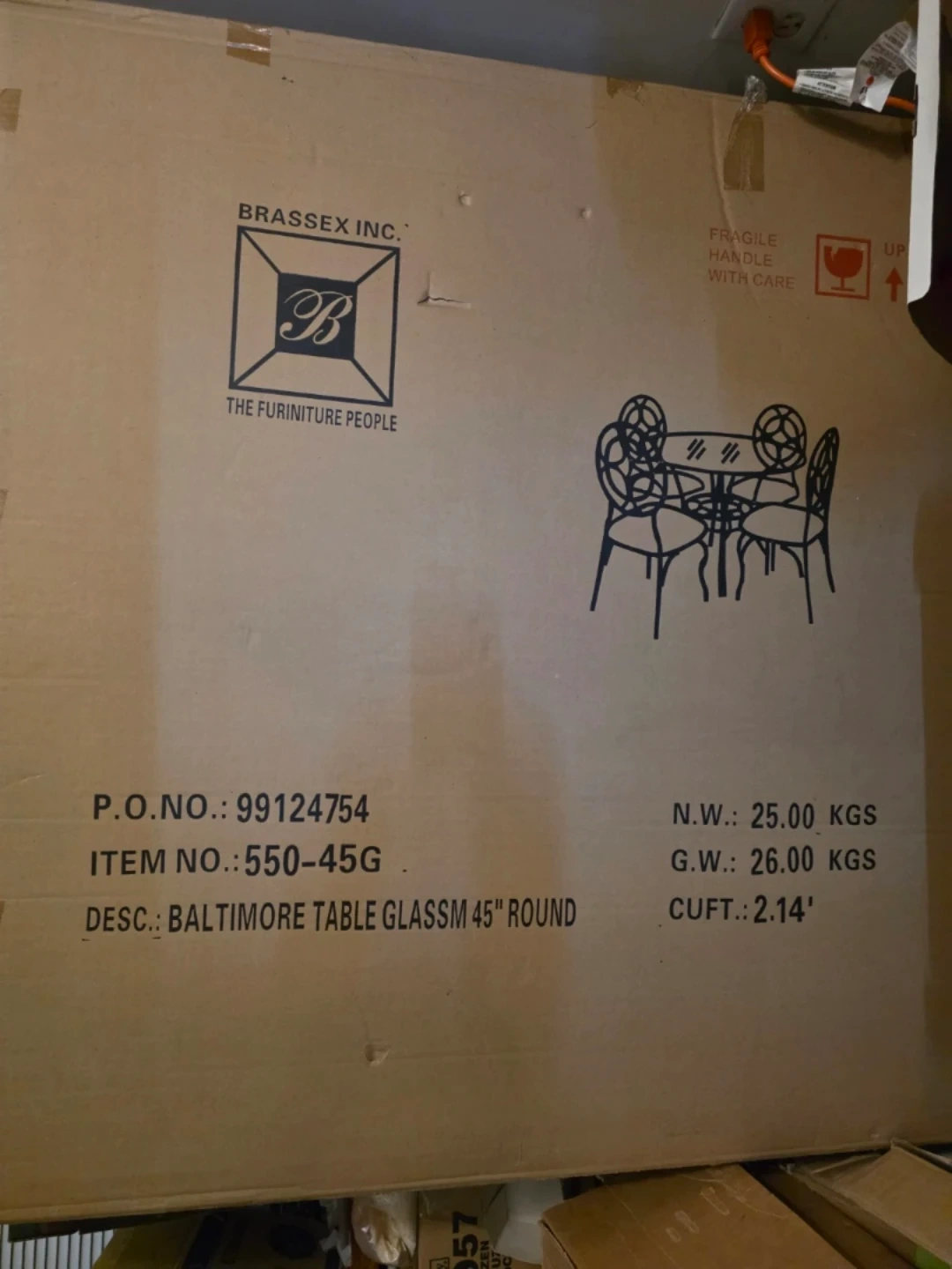 This is a Brassex Baltimore table with a 45" round glass top. It comes in its original packaging and is described as a furniture item. The net weight is 25.00 KGS and the gross weight is 26.00 KGS with 4 chairs.