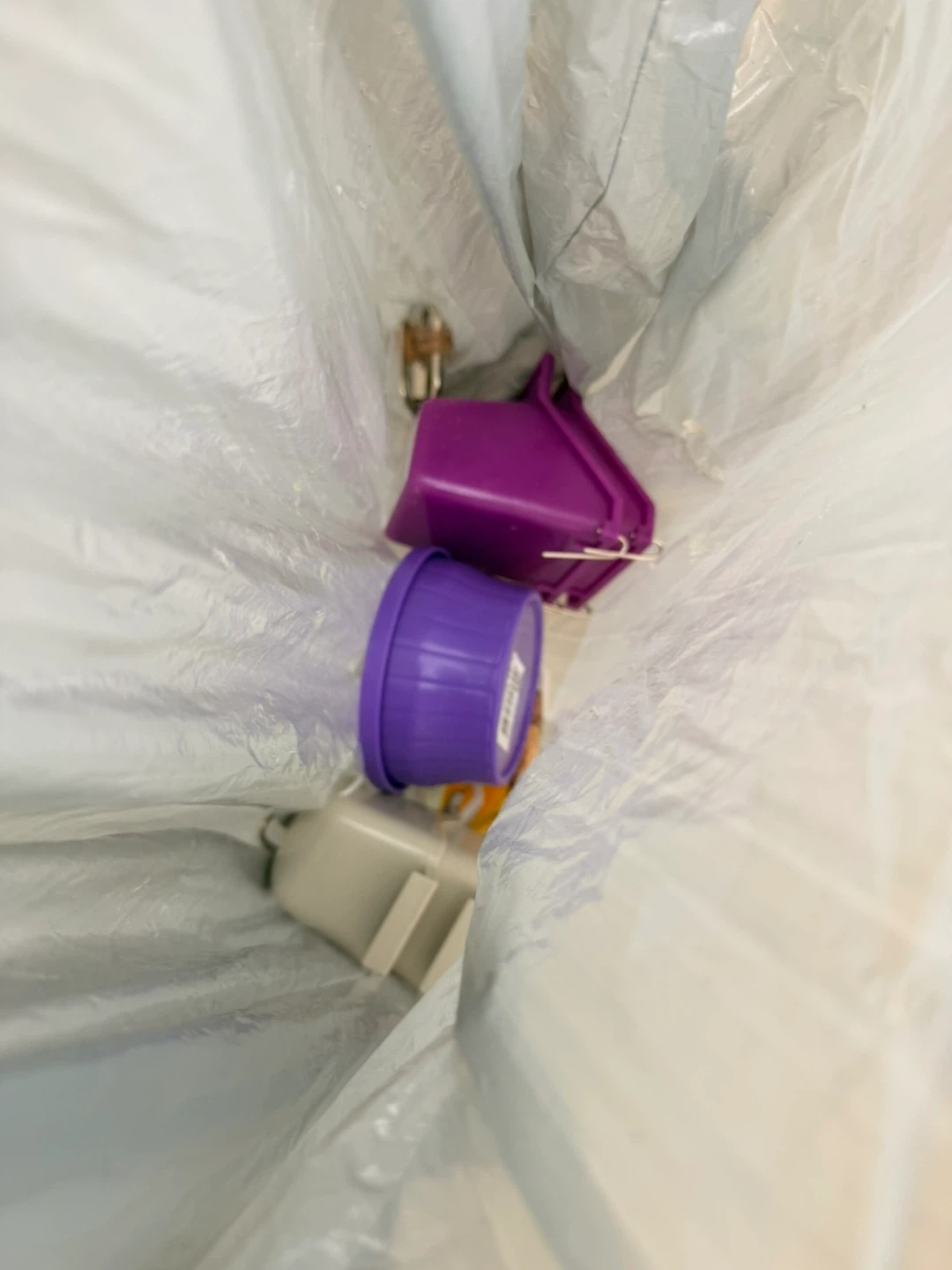 White bird cage with multiple perches and toys. Includes food and water dishes. Tray at the bottom for easy cleaning. It's suitable for small birds.