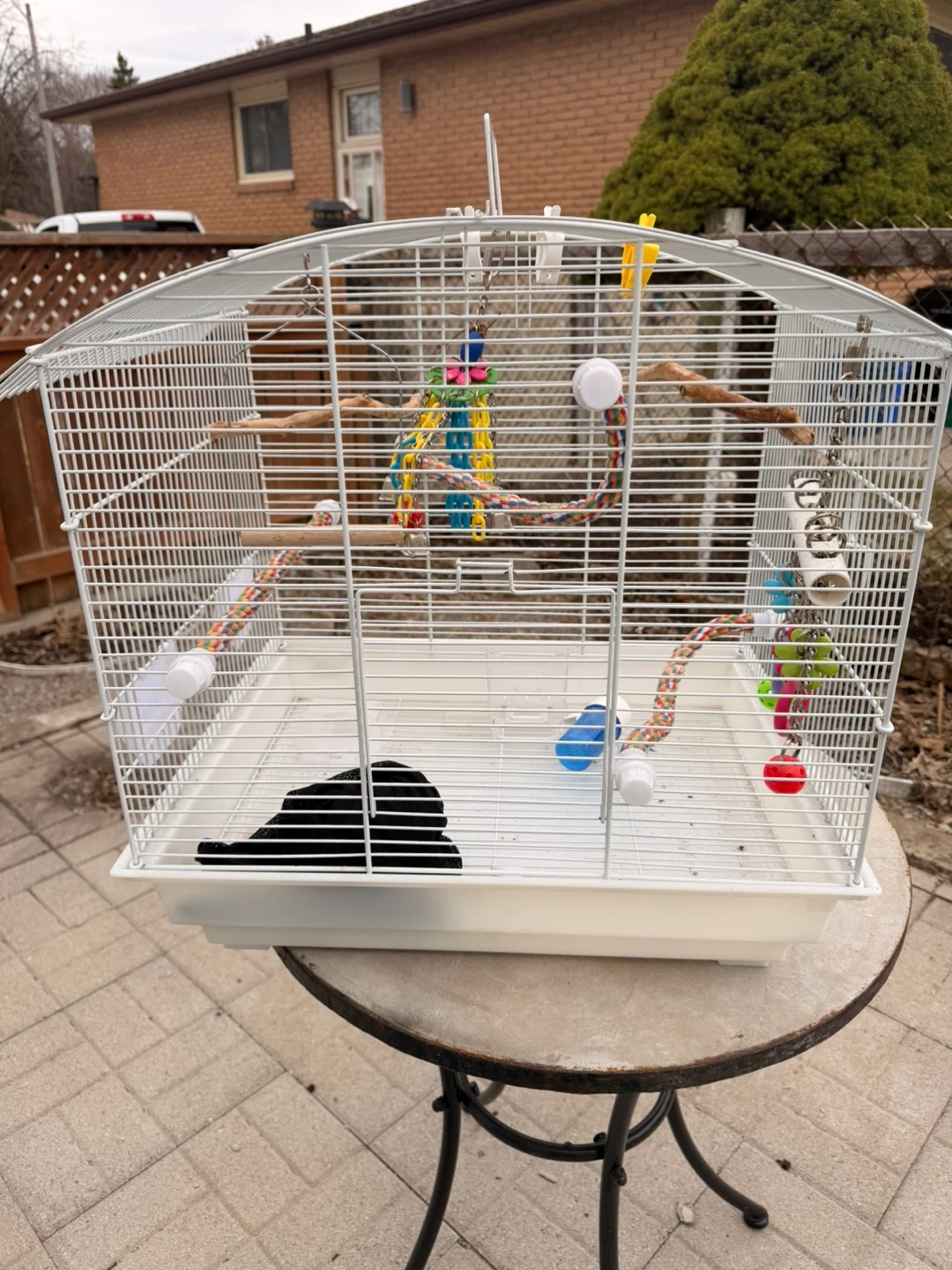 White bird cage with multiple perches and toys. Includes food and water dishes. Tray at the bottom for easy cleaning. It's suitable for small birds.