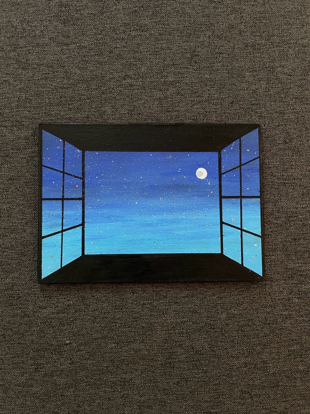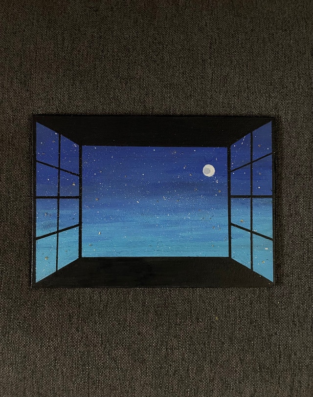 A starry night in this window view painting. The deep blue hues and subtle gold accents. Made by me.