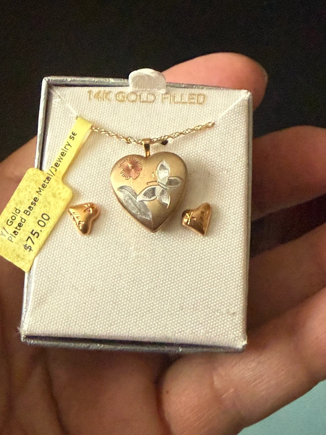 An 18” 14K gold filled heart locket necklace and matching 6mm stud earrings. The locket has a butterfly and floral design. It comes presented in its original box. This set is a lovely gift for someone special on Valentine’s Day